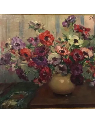 Dieses Blumenstillleben von Hubert Glansdorff aus dem Jahr 1939 zeigt einen üppigen Strauß Anemonen in einer bauchigen Keramikvase. Das Ölgemälde besticht durch seine leuchtende Farbigkeit und den lebendigen, pastosen Pinselduktus, der den Blüten eine besondere Frische und Ausdruckskraft verleiht.