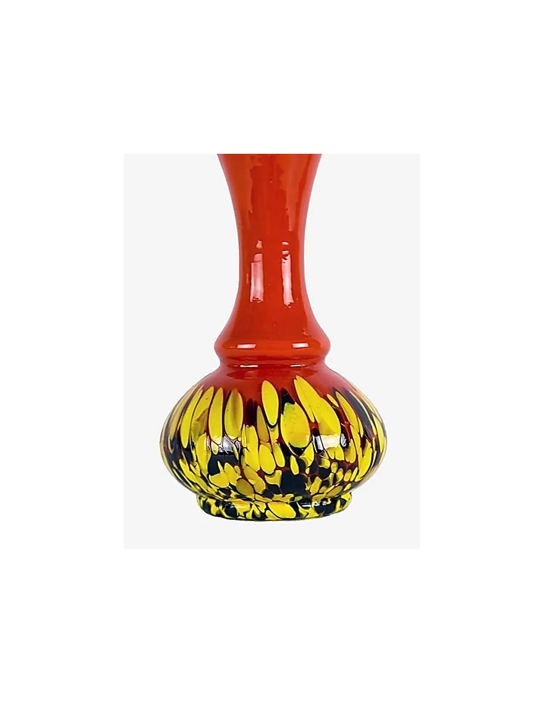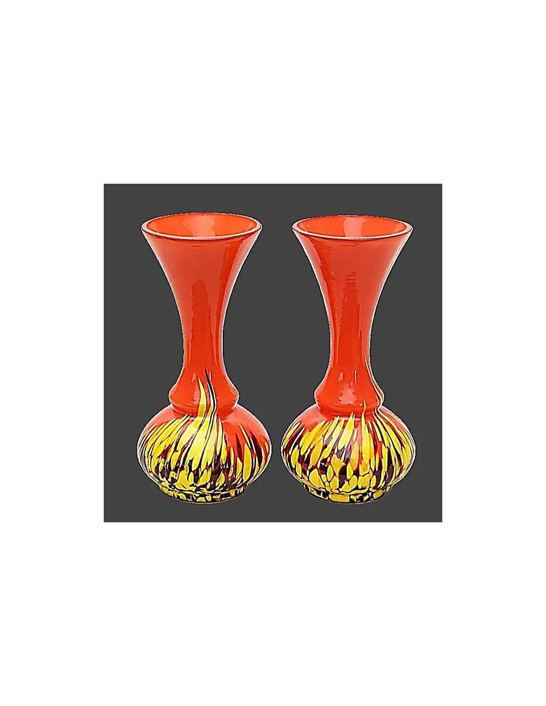 Die Vasen bestehen aus farblosem Überfangglas mit leuchtenden Farbakzenten in Orange, Gelb, Schwarz und Violett. Typisch für die sogenannte Tango-Glastechnik sind die kontrastreichen Farbverläufe, die durch das Aufschmelzen farbiger Glasfäden entstehen.