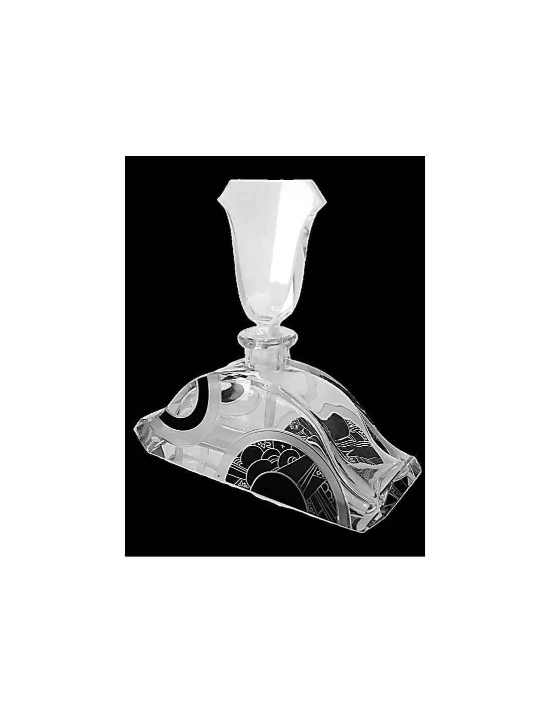 Die Form des Korpus ist dynamisch, asymmetrisch und sehr modern für ihre Zeit. Die Oberfläche des Glases ist mit einem tiefen Schliff verziert, der geometrische und stilisierte Muster kombiniert: Breite, geschwungene Linien erzeugen fließende Bewegungen. Der Kontrast zwischen den klaren, geschliffenen Flächen und den matten und gravierten Teilen des Dekors mit Schwarzlotmalerei ist ein typisches Merkmal der Art Déco Epoche.