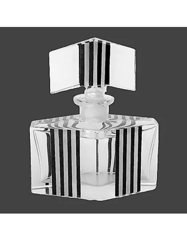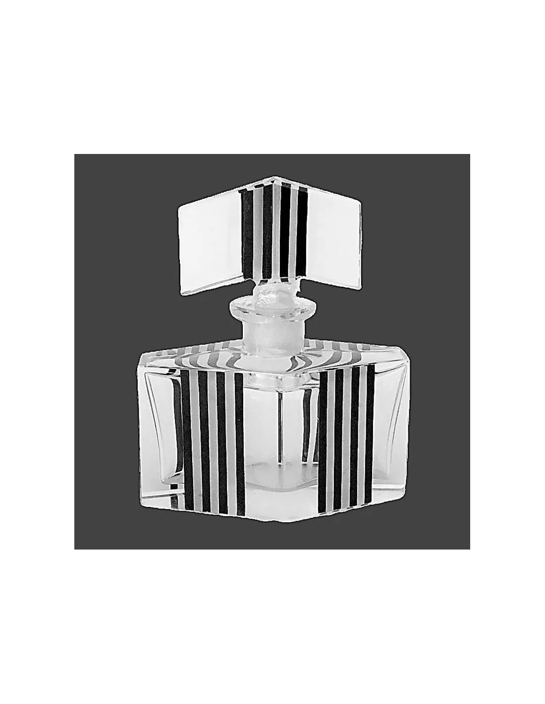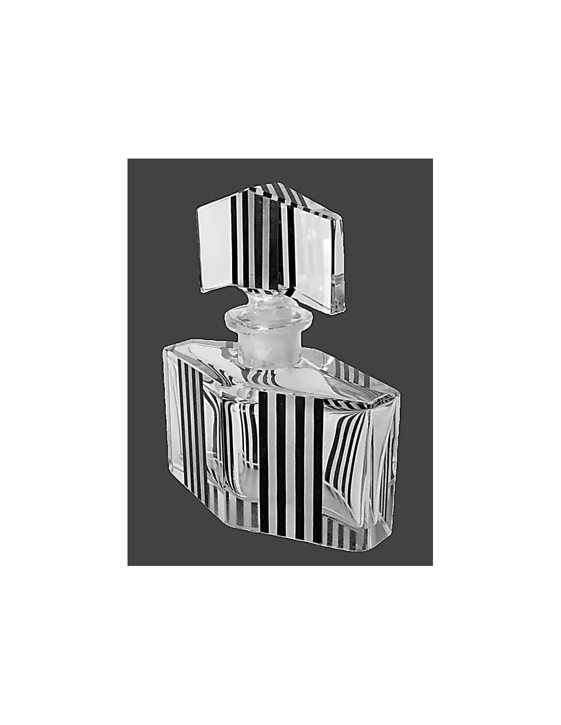Dieser Parfümflakon ist ein hervorragendes Beispiel für das Art Déco Design der 1930er Jahre. Gefertigt aus hochwertigem, facettiertem böhmischem Kristall, besticht der Flakon durch seine klare geometrische Form und die elegante Kombination aus Transparenz und schwarzem, vertikal gestreiftem Dekor aus Schwarzlotmalerei.