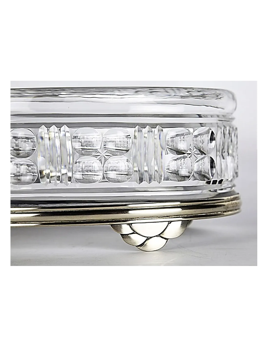 Der schwere Kristallkorpus ruht auf einem Silbersockel aus 800er Silber, die den Art Déco Stil des Tafelaufsatzes wunderschön unterstreichen. Die Silbermontierung trägt die Signatur der belgischen Silberschmiede Delheid Frères.