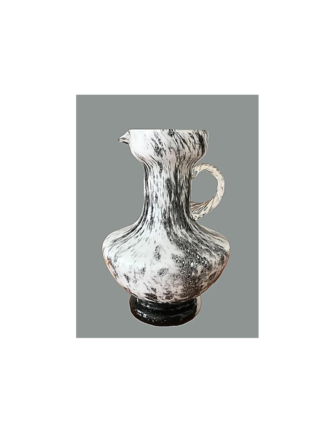 Die Vase hat einen bauchigen Körper mit schmalem, hohem Hals. Sie ist aus weißem Opalglas gefertigt mit schwarzen und grauen Einsprenkelungen. Der geschwungene Henkel verleiht der Vase eine elegante Note.