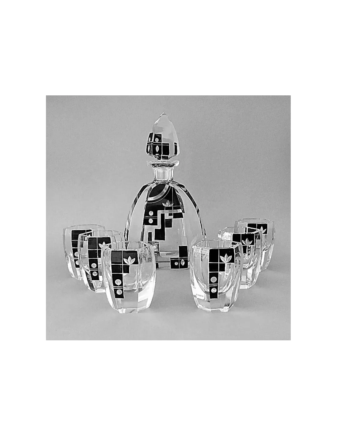 Dieses elegante Likörservice aus böhmischem Kristall umfasst eine bauchige Karaffe mit facettiertem Stopfen sowie sechs passende Becher. Besonders hervorzuheben ist die geometrische Dekoration in Schwarzlot-Malerei, die mit Kreis-, Quadrat- und Blattmotiven eine klare, stilisierte Ornamentik entfaltet.