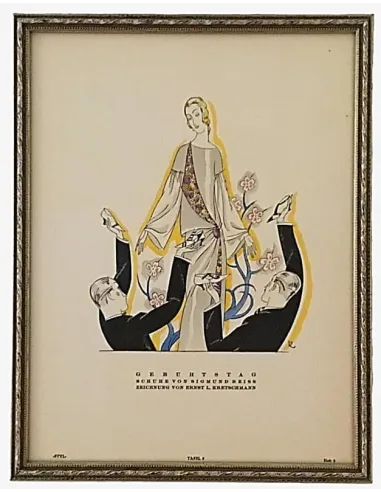 Mit seinen stilisierten Formen, der feinen Linienführung und der eleganten Farbanwendung verkörpert „Geburtstag“ die Formensprache der Zeit zwischen Jugendstil und Art Déco. Die Komposition dieses Blattes ist nicht nur modisch, sondern auch künstlerisch relevant und ein Sammlerstück für Liebhaber von Modegrafik und historischem Design.