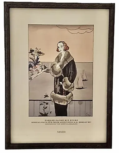 Das STYL-Blatt mit einem Modell aus dem "Spezialhaus für Pelze Adolf Doll A.G. Berlin" zeigt den Entwurf einer "Fohlen-Jacke mit Fuchs", umgesetzt in einer Zeichnung von Gert Gagelmann. Das Blatt ist ganz im Stil der Art-Deco-Epoche gehalten.