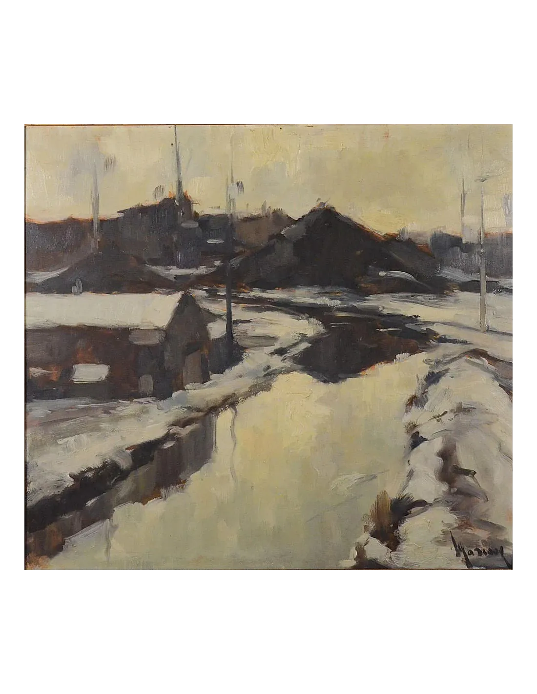 Das Gemälde von Albert Mascaux zeigt eine ruhige, verschneite Winterlandschaft - sehr wahrscheinlich in den Ardennen. Der aus der Wallonie stammende Maler Mascaux liebte es, die Landschaft der Ardennen zu malen und benutzte hierzu gerne Grau- und Brauntöne. Schneebedeckte Dächer, kahle Bäumen, ein vereister Fluss und ein diffuses, winterliches Licht fangen die stille Atmosphäre des verschneiten Dorfes ein. Das Gemälde verbindet natürliche Harmonie mit einer nostalgischen Stimmung, typisch für Mascauxs belgischen Realismus des 20. Jahrhunderts.