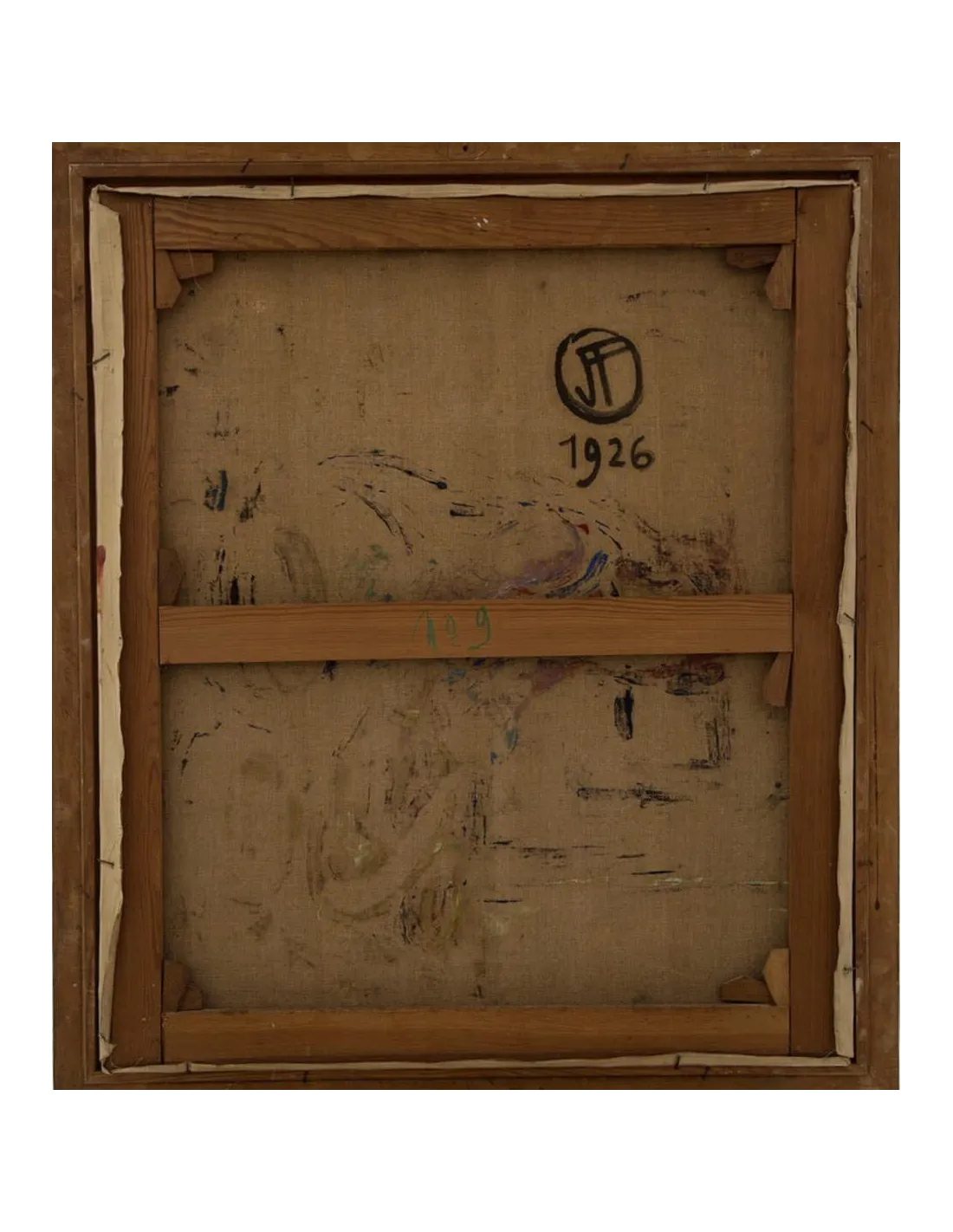 Der originale Stuckrahmen aus der ersten Hälfte des 20. Jahrhunderts ergänzt das Werk harmonisch und unterstreicht seinen historischen Charakter.