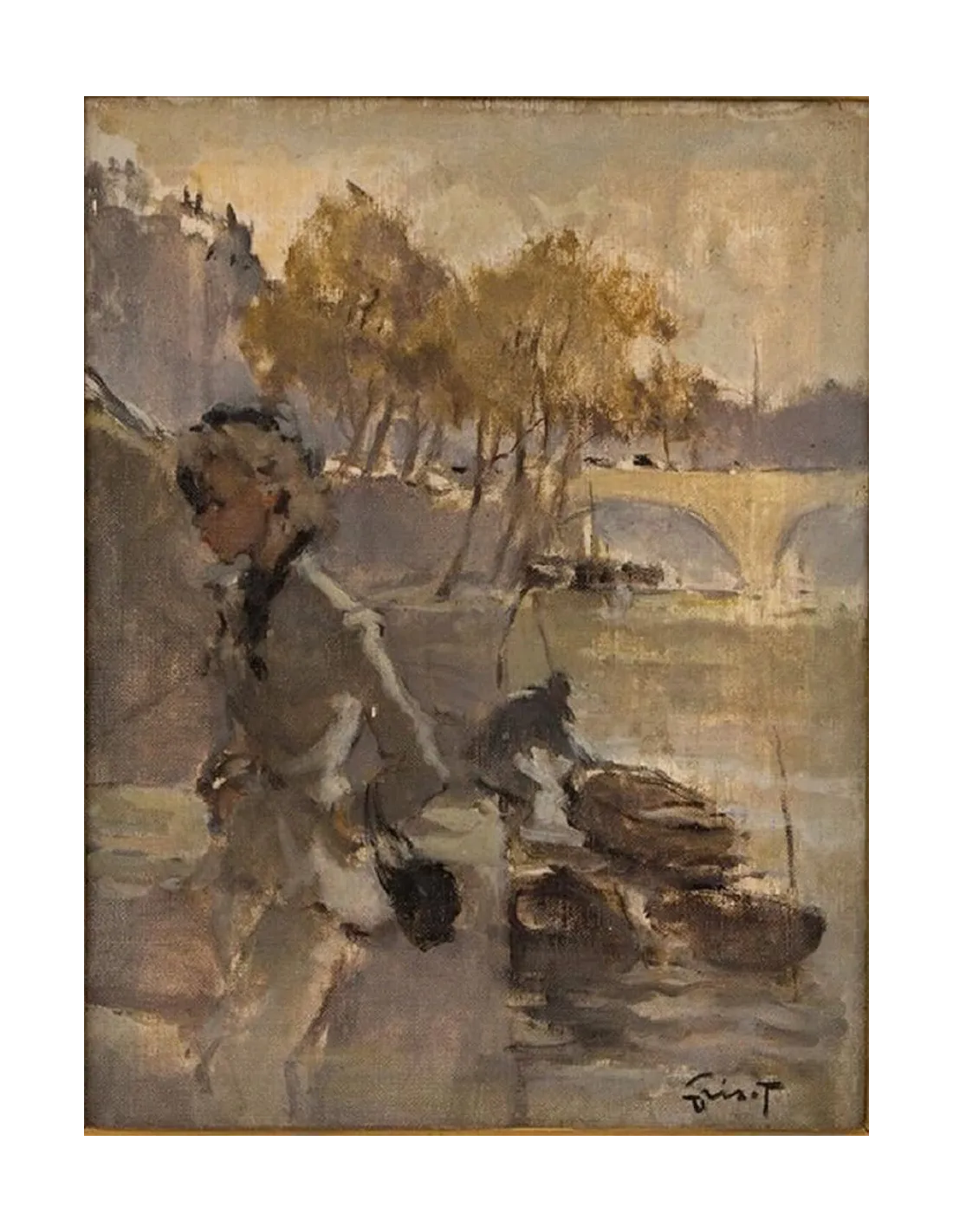 Das Gemälde des französischen Malers Pierre Grisot zeigt eine stimmungsvolle Flussszene. Im Vordergrund geht eine elegant gekleidete junge Frau an einem Bootssteg am Flussufer. Die Szene ist von herbstlich gefärbten Bäumen umrahmt. Eine steinerne Brücke im Hintergrund rundet die harmonische Komposition ab. Die feine Farbpalette aus Pastelltönen – Grau, Ocker, Braun und zartem Grün – schafft eine ruhige und nostalgische Atmosphäre, typisch für Griots poetische Malweise. Der reich verzierte, originale Rahmen unterstreicht die klassische Ästhetik des Werks.