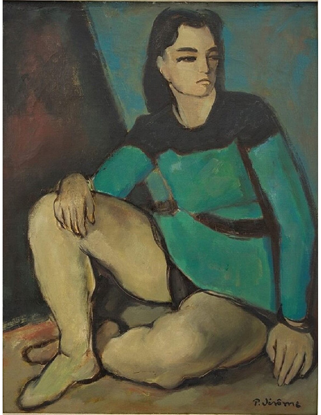 Jérômes kompositorisches Talent zeigt sich in der harmonischen Verbindung von Figur, Raum und Farbe. Der Maler verbindet in diesem Werk klassische Figuration mit einer modernen, fast skulpturalen Formensprache. Die vereinfachten Körperformen, der flächige Farbauftrag und die klaren Umrisslinien erinnern an die Ästhetik des frühen 20. Jahrhunderts, beeinflusst von Künstlern wie Léger und Picasso. Farblich dominiert ein kühles, gedämpftes Spektrum, das die kontemplative Haltung der Figur unterstreicht. Der Stil ist expressiv, aber kontrolliert – ein Markenzeichen von Jérômes malerischer Handschrift, bei der das Emotionale stets durch Komposition und Form geführt wird.