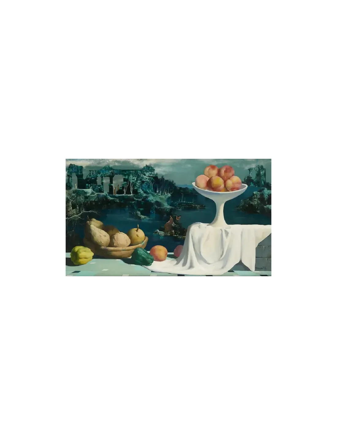 Im Vordergrund dominieren üppige Früchte – sorgfältig arrangiert und meisterhaft modelliert. Diese sinnliche Darstellung verweist auf Themen wie Fruchtbarkeit und Vergänglichkeit. Dahinter entfaltet sich eine fantastische Szenerie: bizarr geformte Felsen, architektonische Fragmente und mögliche Ruinen erzeugen eine geheimnisvolle Bildtiefe mit symbolischer Aufladung.