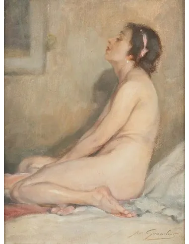 Das Aktgemälde von Jean Léon Henri Gouweloos, exklusiv bei ART FLAGEY Kunsthandel Berlin, zeigt eine junge Frau in sitzender Profilansicht.