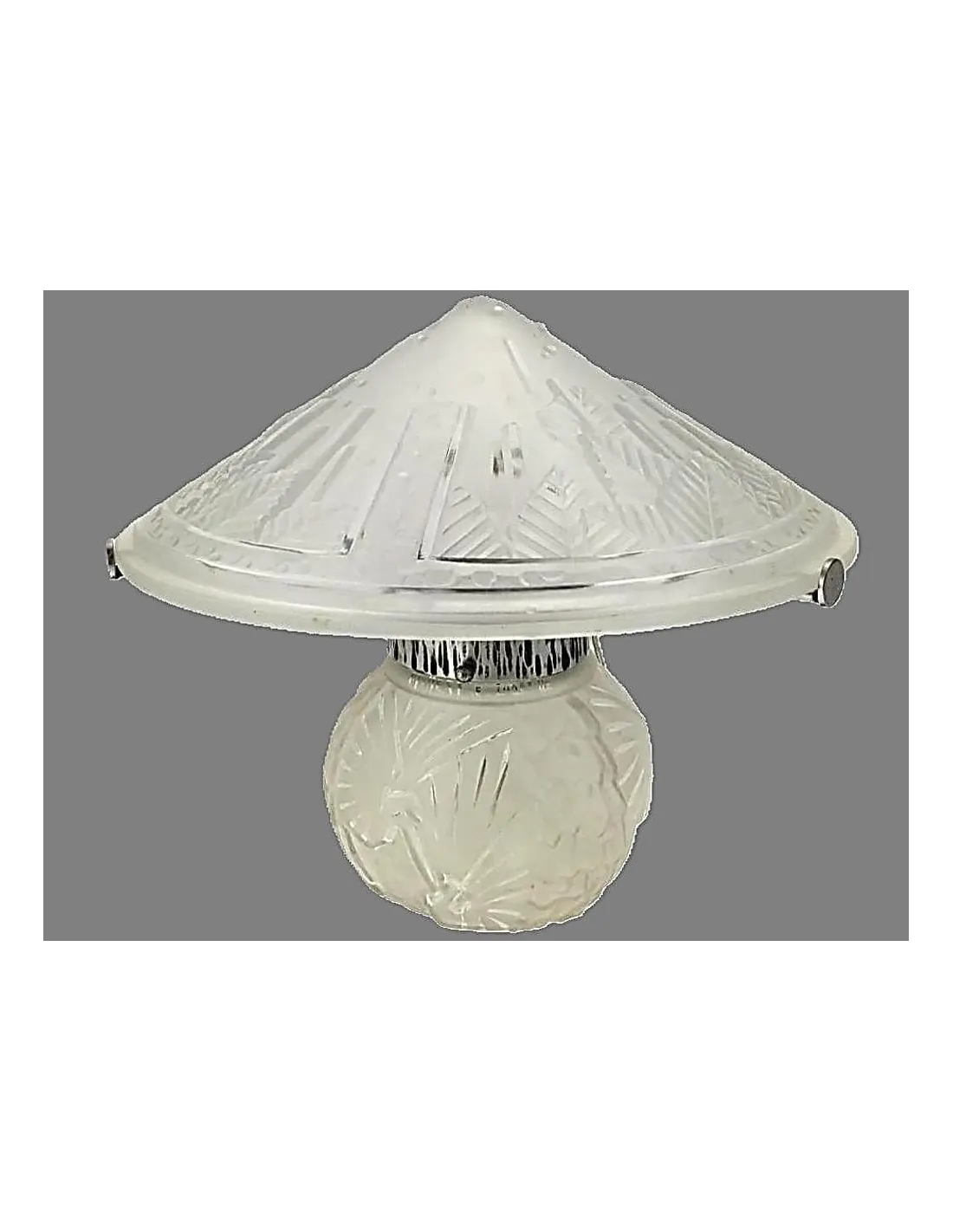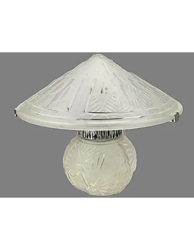 Diese signierte Art Déco Tischleuchte von Muller Frères aus Lunéville ist ein herausragendes Beispiel französischer Glaskunst der 1920er Jahre. Das charakteristische Design mit einem pagodenförmigen Schirm und einem kugelförmigen, reliefverzierten Glasfuß vereint dekorative Eleganz und technische Raffinesse.