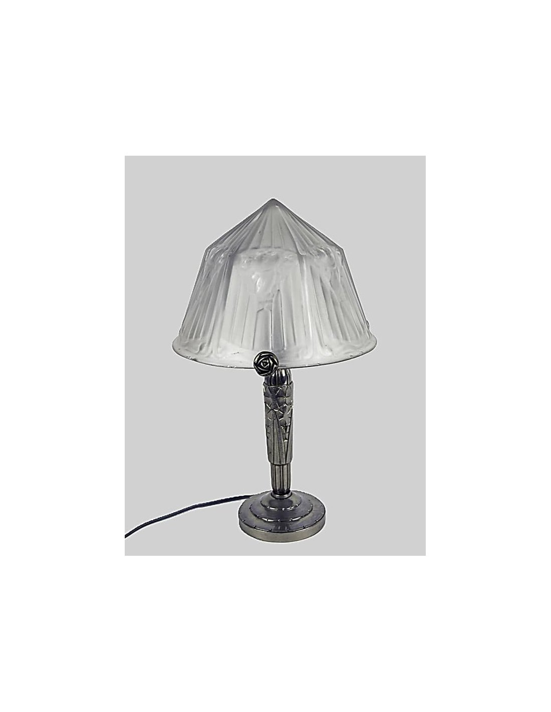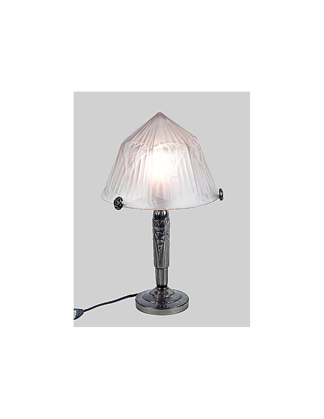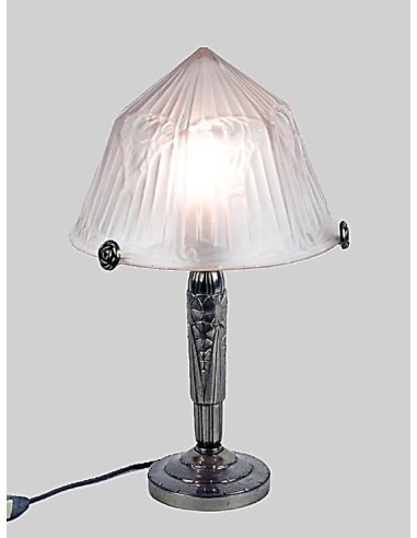 Feine kleine Tischleuchte im klassischen französischen Art Déco Stil, gefertigt um 1925. Der Lampenschirm in charakteristischer Champignon-Form besteht aus satiniertem Pressglas mit einem geometrisch-facettierten Muster, das in Kombination mit dem Licht eine subtile Tiefenwirkung erzeugt.