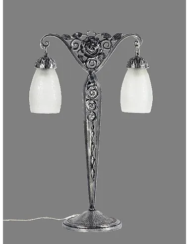 Der schmiedeeiserne, schlanke Fuß ist mit einem filigranen, floralen Rosendekor geschmückt und trägt einen doppelten Lampenschirm aus satiniertem Glas. Die Lampe präsentiert sich mit einer stattlichen Höhe von 60 cm.