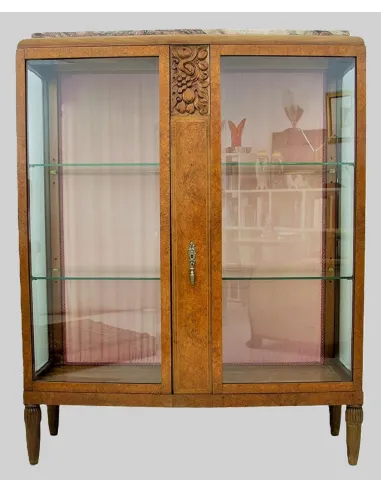 Diese französische Art-Déco-Vitrine aus den 1920er-Jahren besticht durch ihre klare Linienführung, das fein gemaserte Wurzelholzfurnier und eine stilvolle florale Schnitzerei sowie eine oben aufliegende beige-rosa Marmorplatte. Das Möbel ruht auf konisch zulaufenden, kannelierten Beinen und ist im Stil der Pariser Moderne gehalten – sachlich, funktional und dekorativ zugleich.