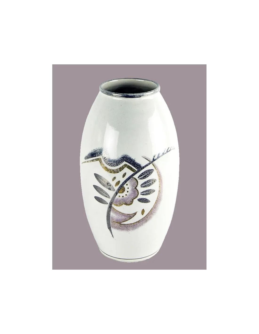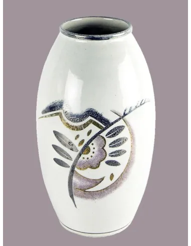 Das Stück ist ein exzellentes Beispiel für die keramische Formensprache des Art Déco der späten 1920er- bis frühen 1930er-Jahre. Gefertigt aus glasierter Keramik mit Emailledekor in Gold und Silber, zeigt die Vase ein stilisiertes, pflanzlich-geometrisches Motiv.