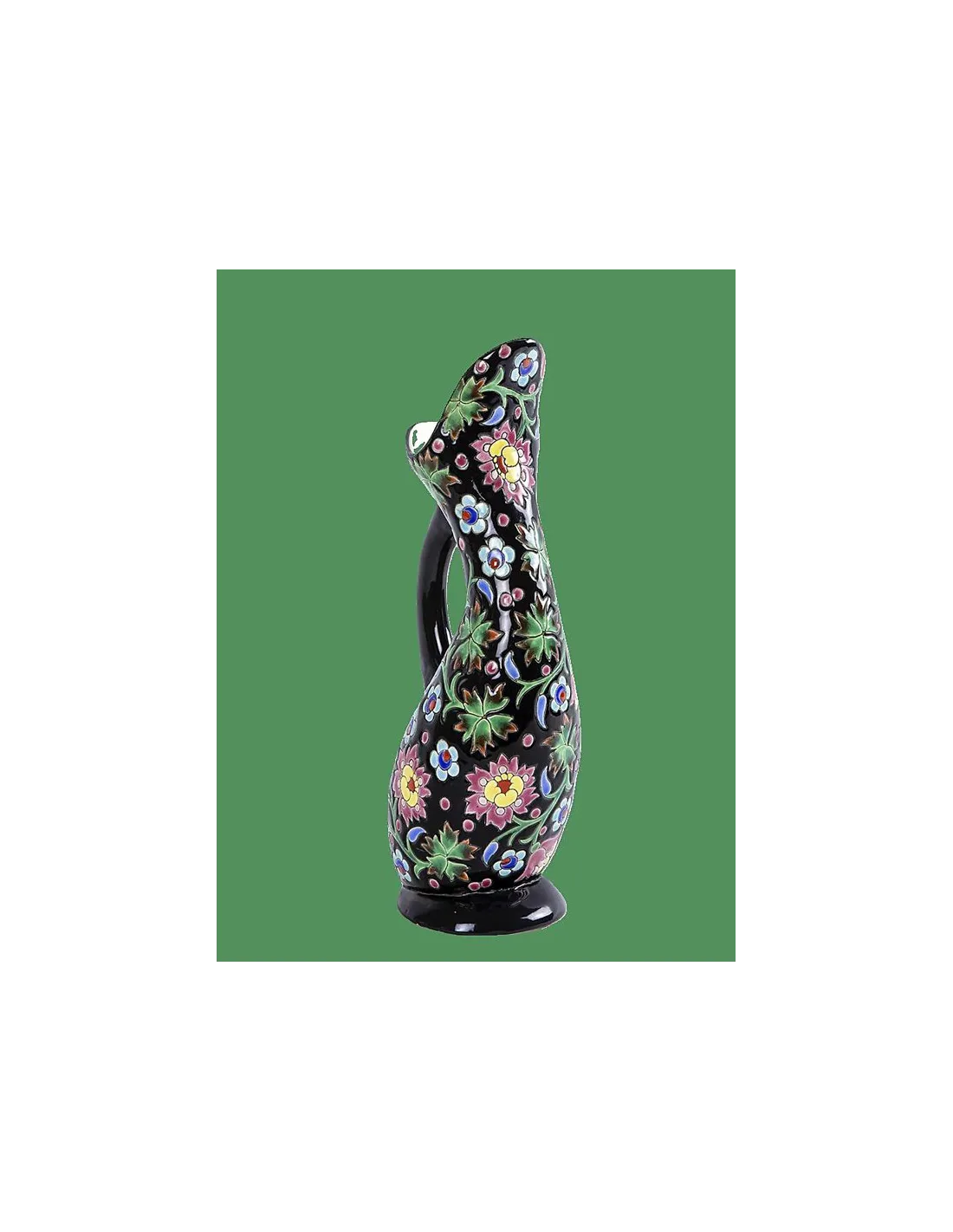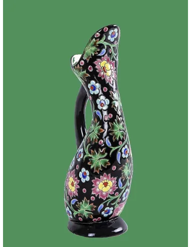 Dieser handbemalte Krug stammt aus der traditionsreichen französischen Manufaktur Emaux de Longwy und wurde um 1955 bis 1975 gefertigt. Er zeigt das für Longwy typische, farbenfrohe Cloisonné-Emaille-Dekor: leuchtend bunte Blumenranken auf einem tiefschwarzen Fond – ein lebendiges Spiel aus Farbe, Form und Kontrast.