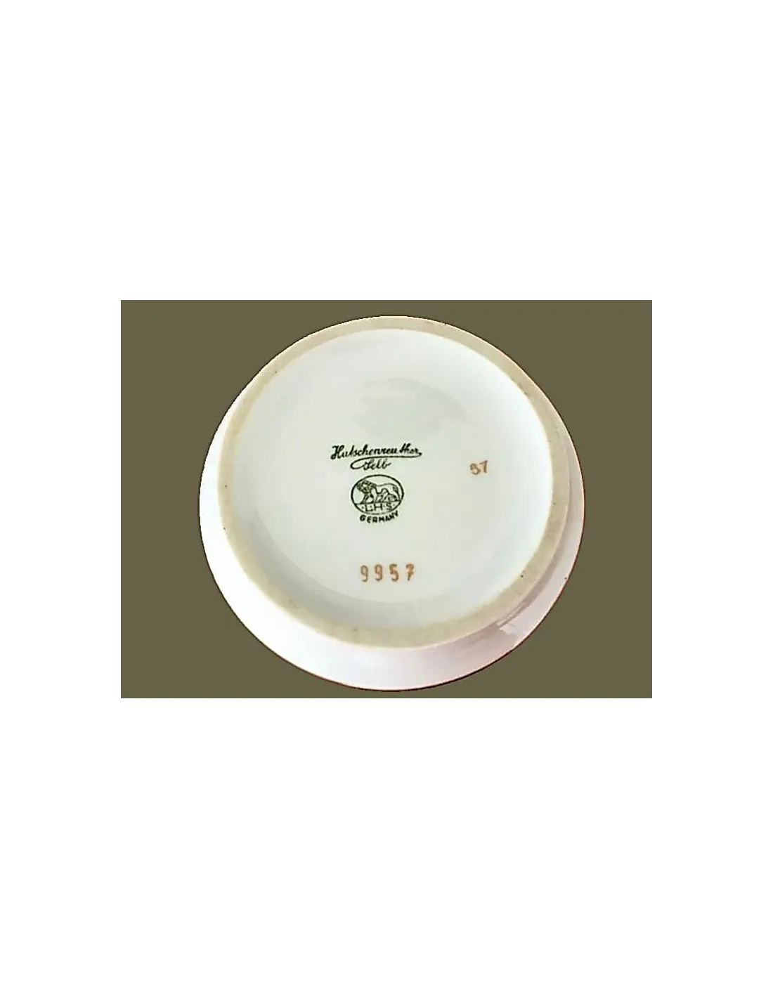 Der schlichte weiße Rand bildet einen reizvollen Kontrast zum reich verzierten Korpus. Die Vase trägt die grüne Bodenmarke „Lorenz Hutschenreuther Selb Germany“ und die Modell- und Dekornummern Nr. 9957 – 57.