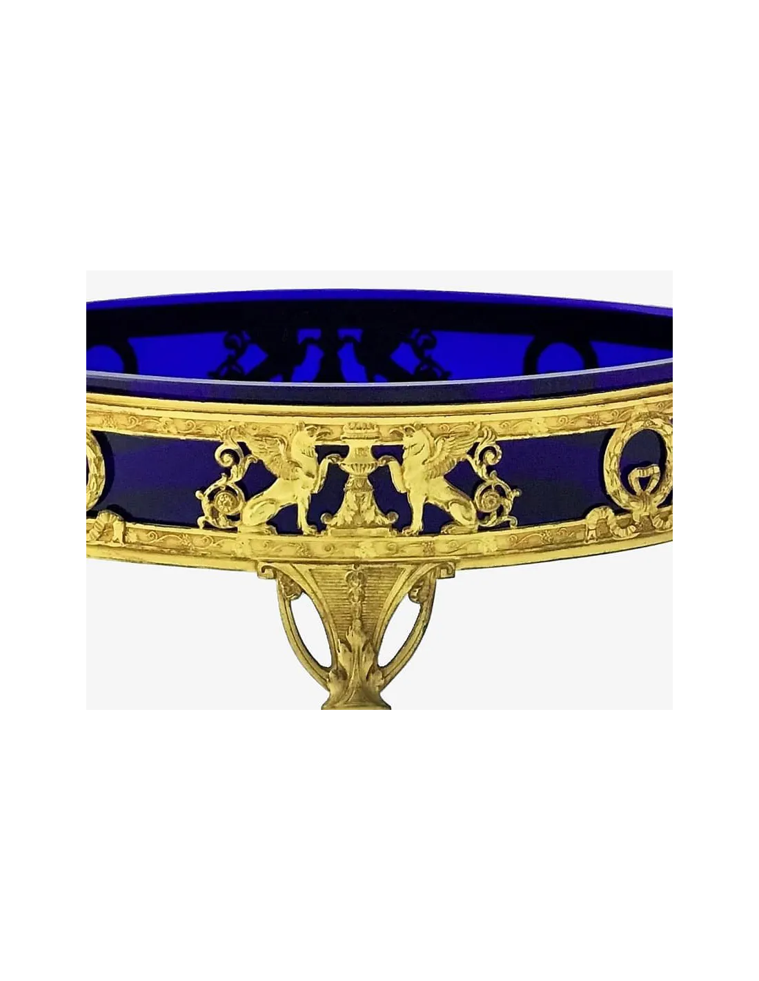 Die fein gearbeitete, ovale Montierung seht auf drei konischen Füßen. Sie besteht aus feuervergoldeter Bronze. Sie zeigt eine umlaufende, durchbrochene Galerie mit antikisierenden Ornamenten wie Greifen, Lorbeerkränzen und Schleifenmotiven. Zwei seitliche Henkel rahmen die Form ein. Der herausnehmbare Einsatz aus kobaltblauem Glas erzeugt einen schönen farblichen Kontrast zur goldglänzenden Bronze.