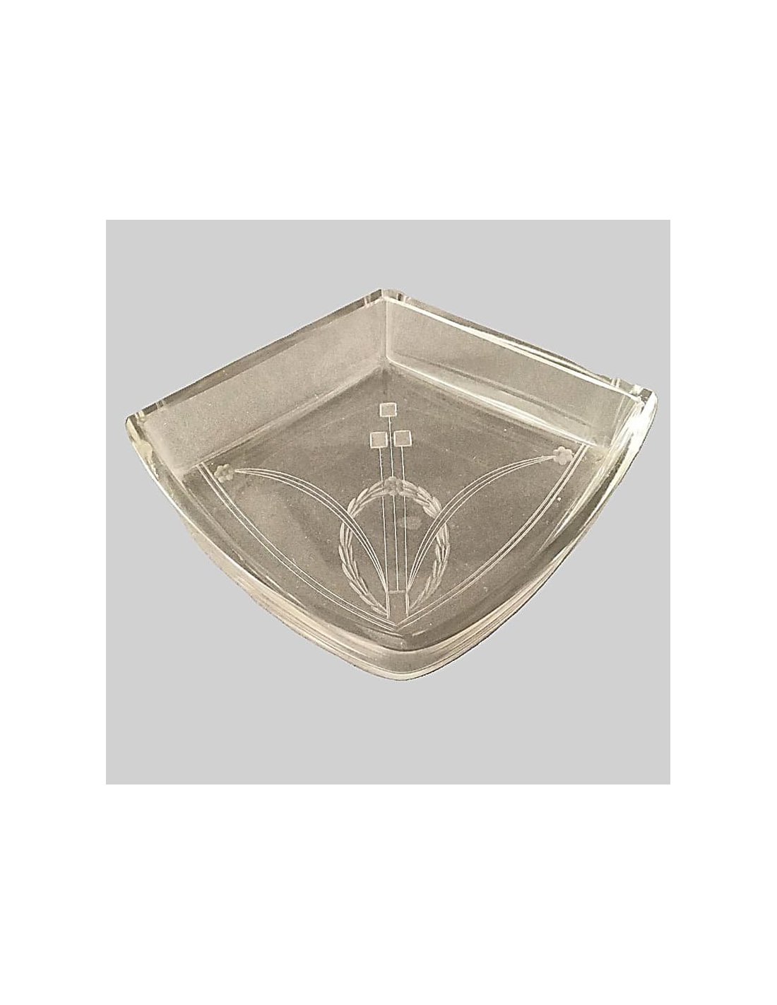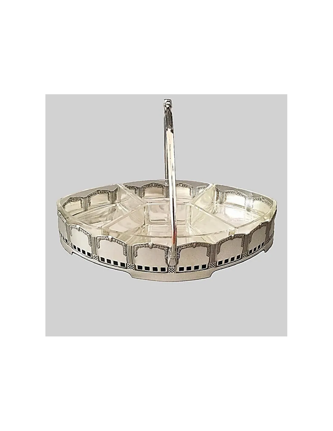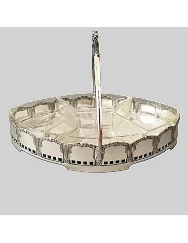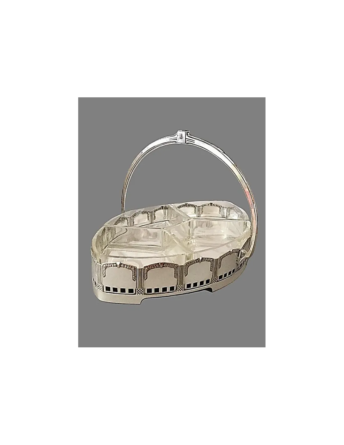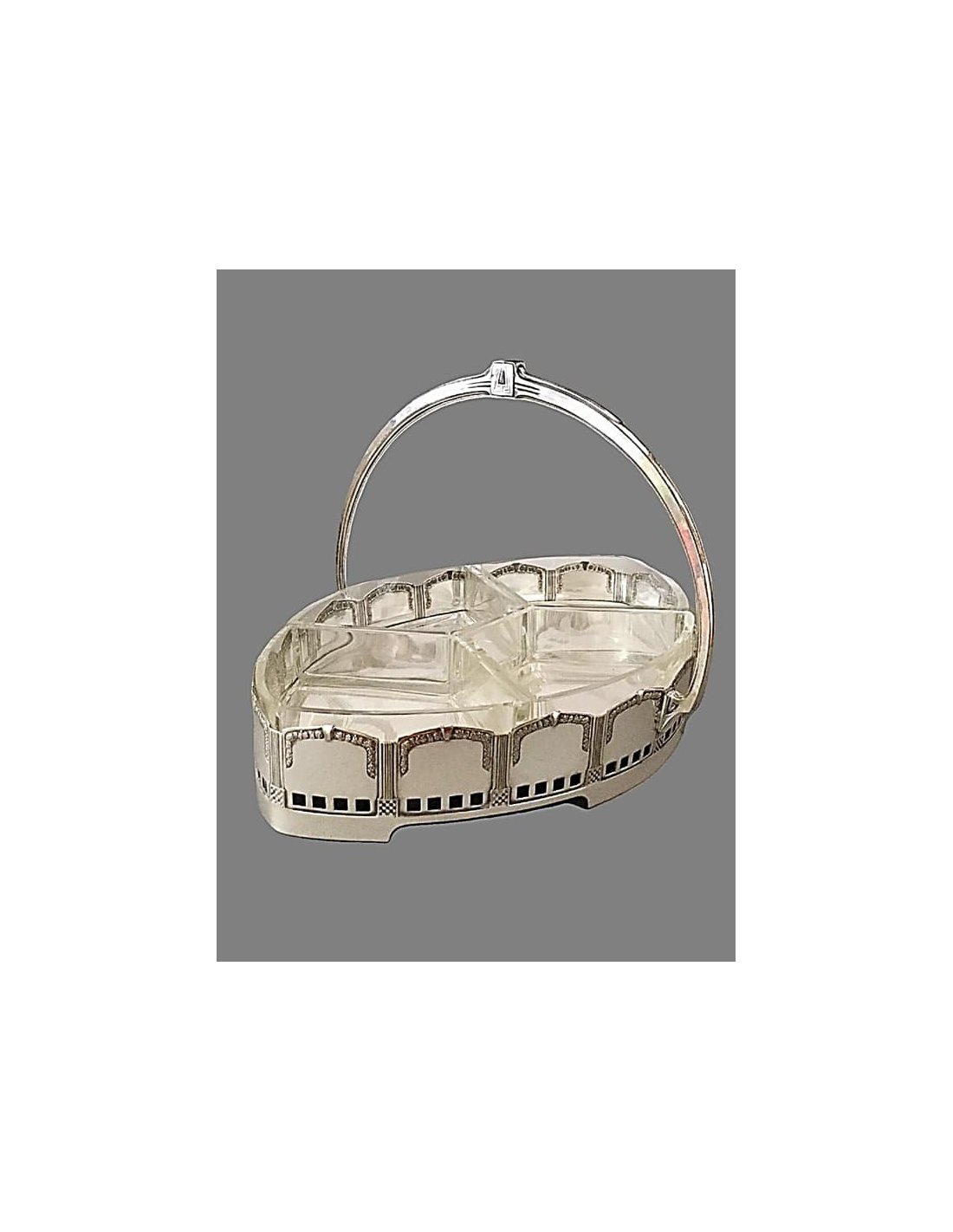 Eleganter Jugendstil Servierkorb aus versilbertem Metall mit Henkel und vier herausnehmbaren Einsätzen aus geschliffenem Kristall. In Ornamentik und Proportion zeigt das Stück den Übergang vom floralen Jugendstil zur klareren Formensprache des frühen 20. Jahrhunderts.