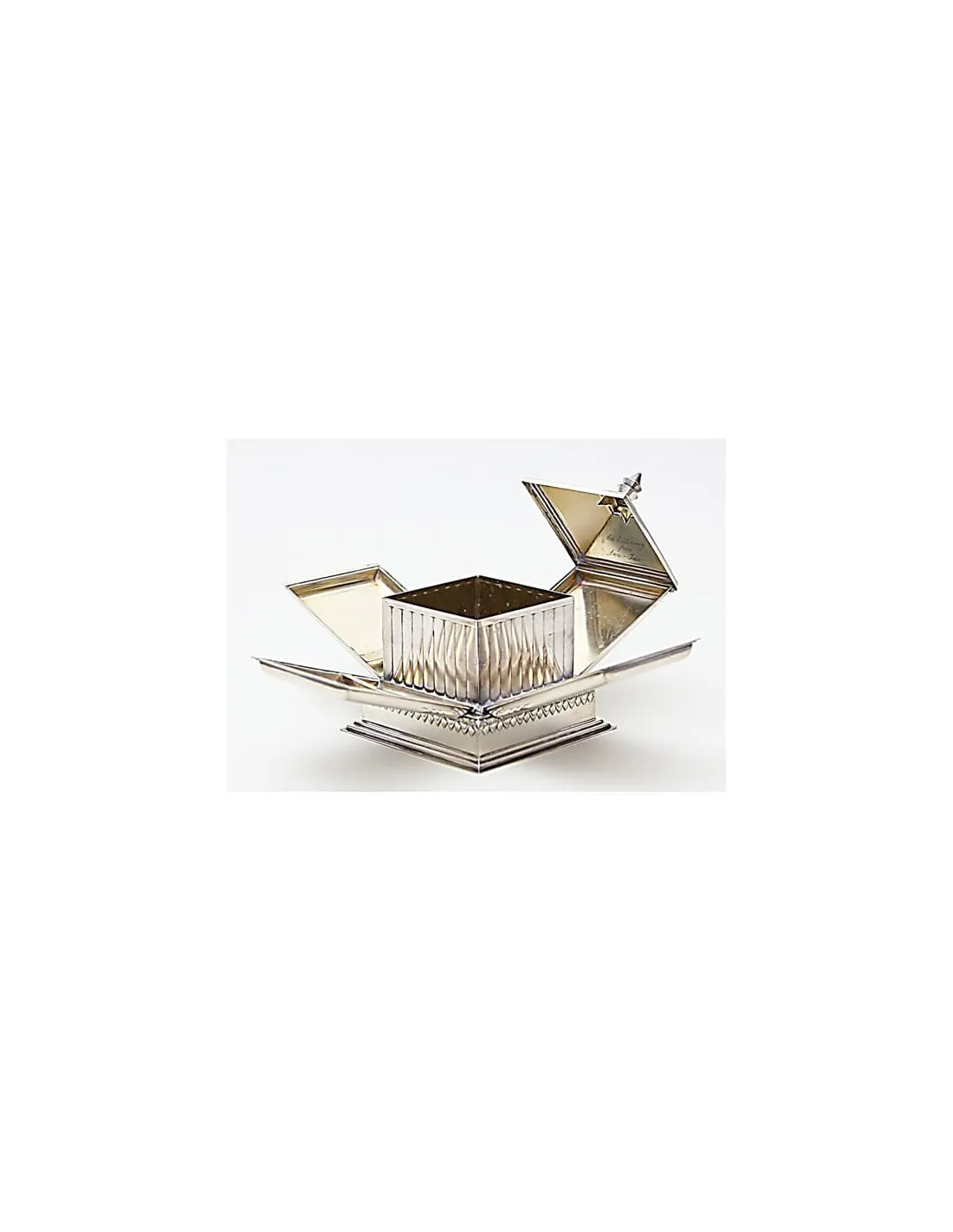 Der Zigarettenspender läßt sich auf vier Seiten aufklappen. Die innenliegenden Zigaretten werden durch Stege gehalten. Verziert ist die Dose schauseitig mit einem Besitzermongramm und auf der Innenseite des Deckels mit einer Widmungsgravur. Den Sockel schmückt ein fein reliefierter Palmettenfries.
