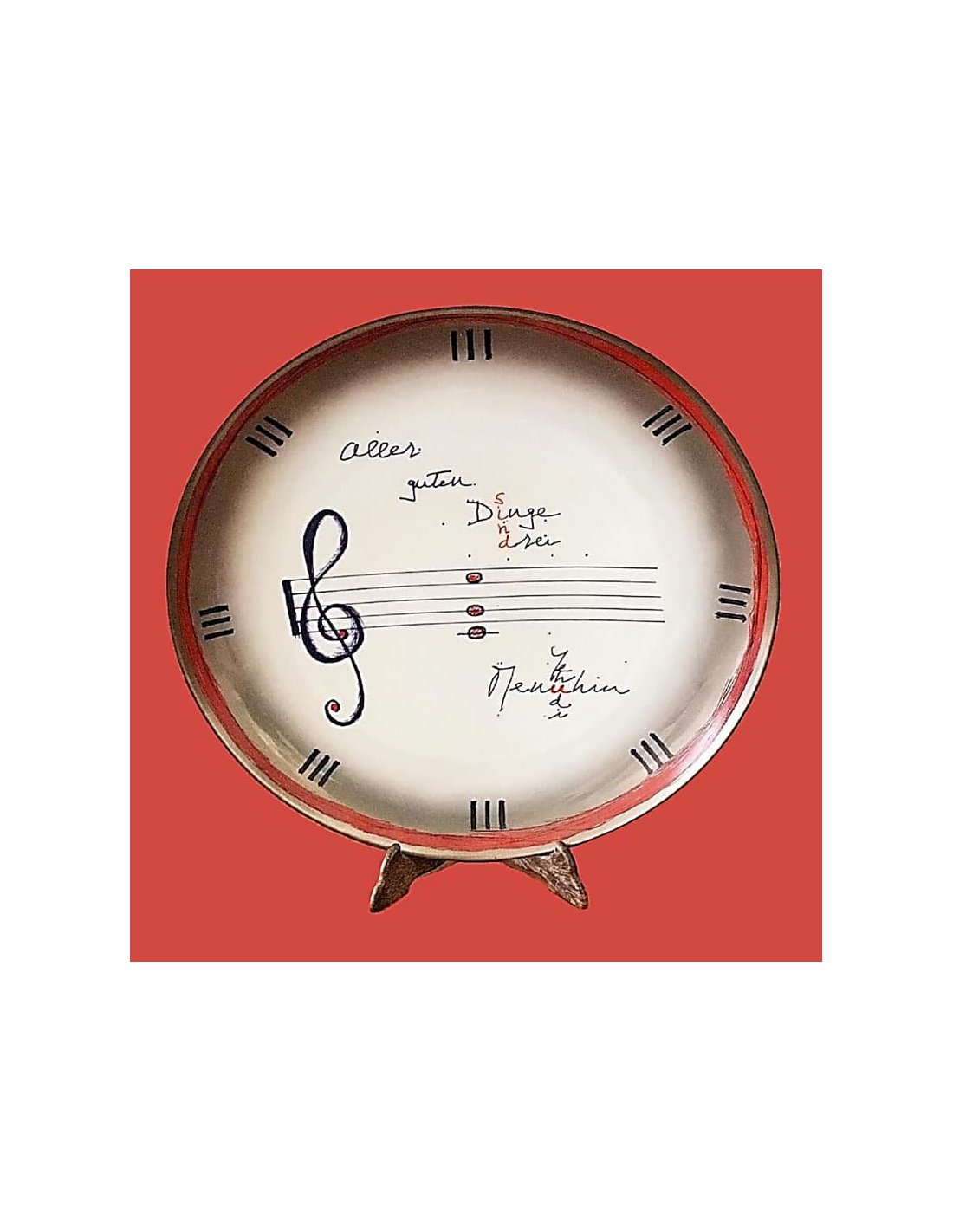 The artist plate N° 10 is titled "All good things come in threes", and, in conjunction with the treble clef and musical staff, clearly references Menuhin's artistic world. Thus, the plate combines fine art with musical symbolism in a simple yet expressive way.