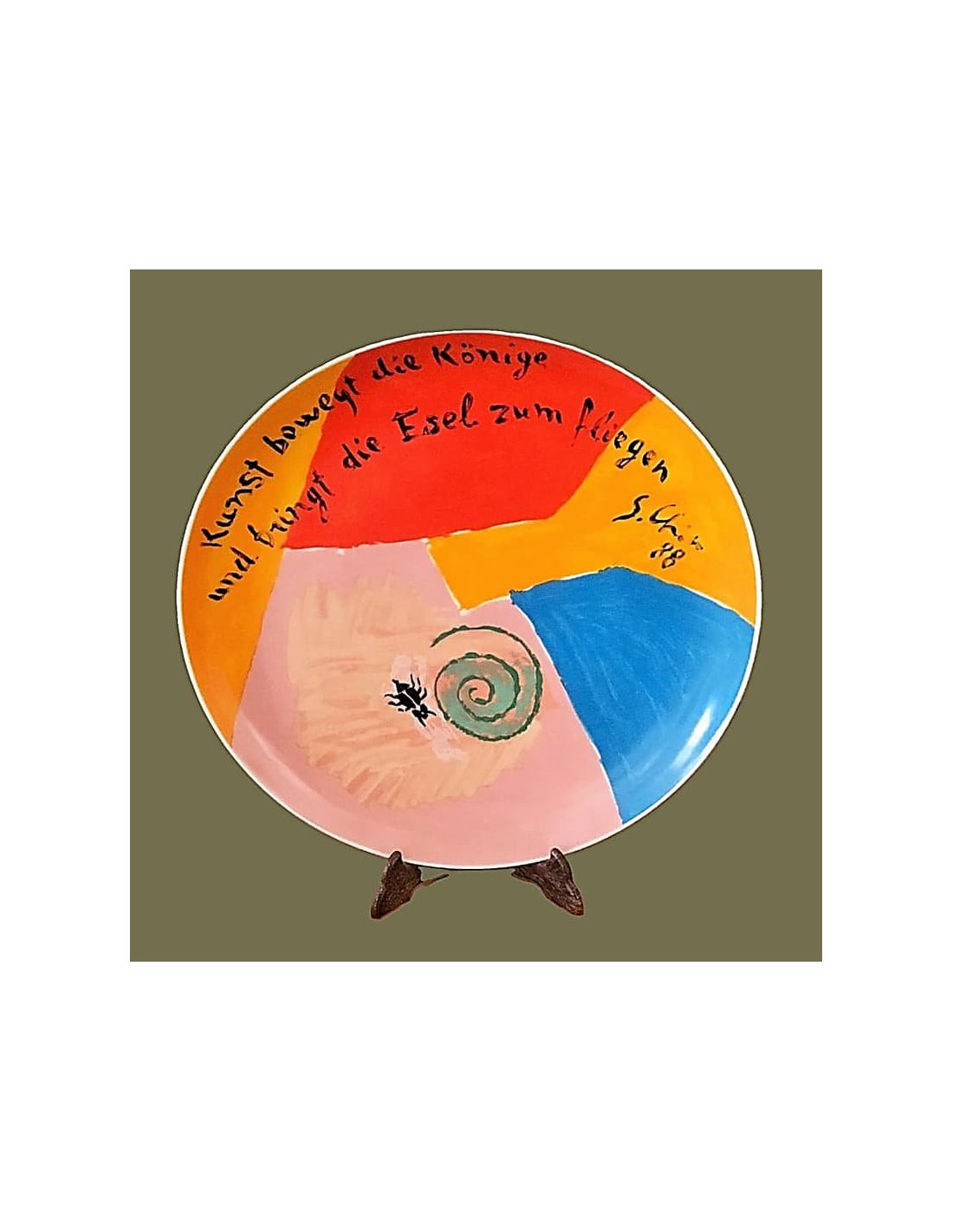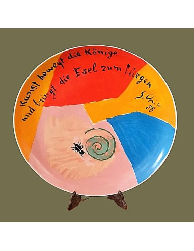 Rosenthal Artist Plate No. 24 by Sandro Chia was released as part of Rosenthal's limited artist edition. With vibrant colors and expressive imagery, the plate captures the characteristic elements of Chia's art on porcelain: dynamic figures, bold contrasts, and a painterly and poetic expression. The result is a fusion of myth, history, and individual imagery. It thus represents the central idea of the transavant-garde—the return to the figure and emotion in painting.