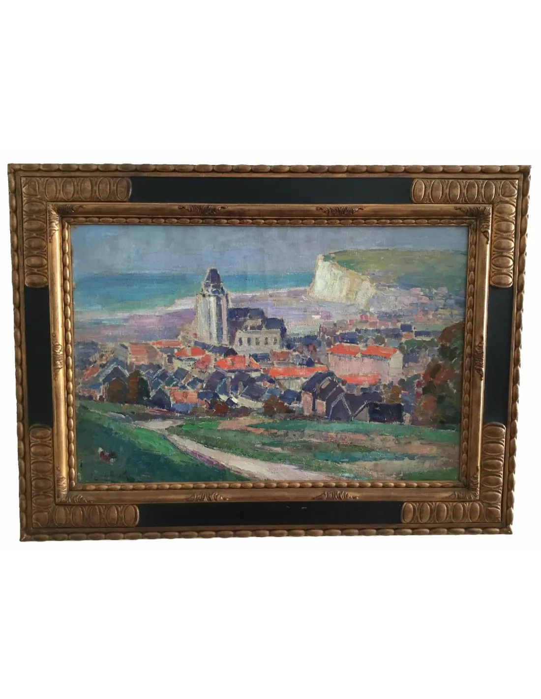 Maurice Blieck's oil painting depicts a picturesque view of a coastal town overlooking a striking white cliff. A church stands at the center, surrounded by red roofs and green fields. The composition combines geometric clarity with vibrant color.