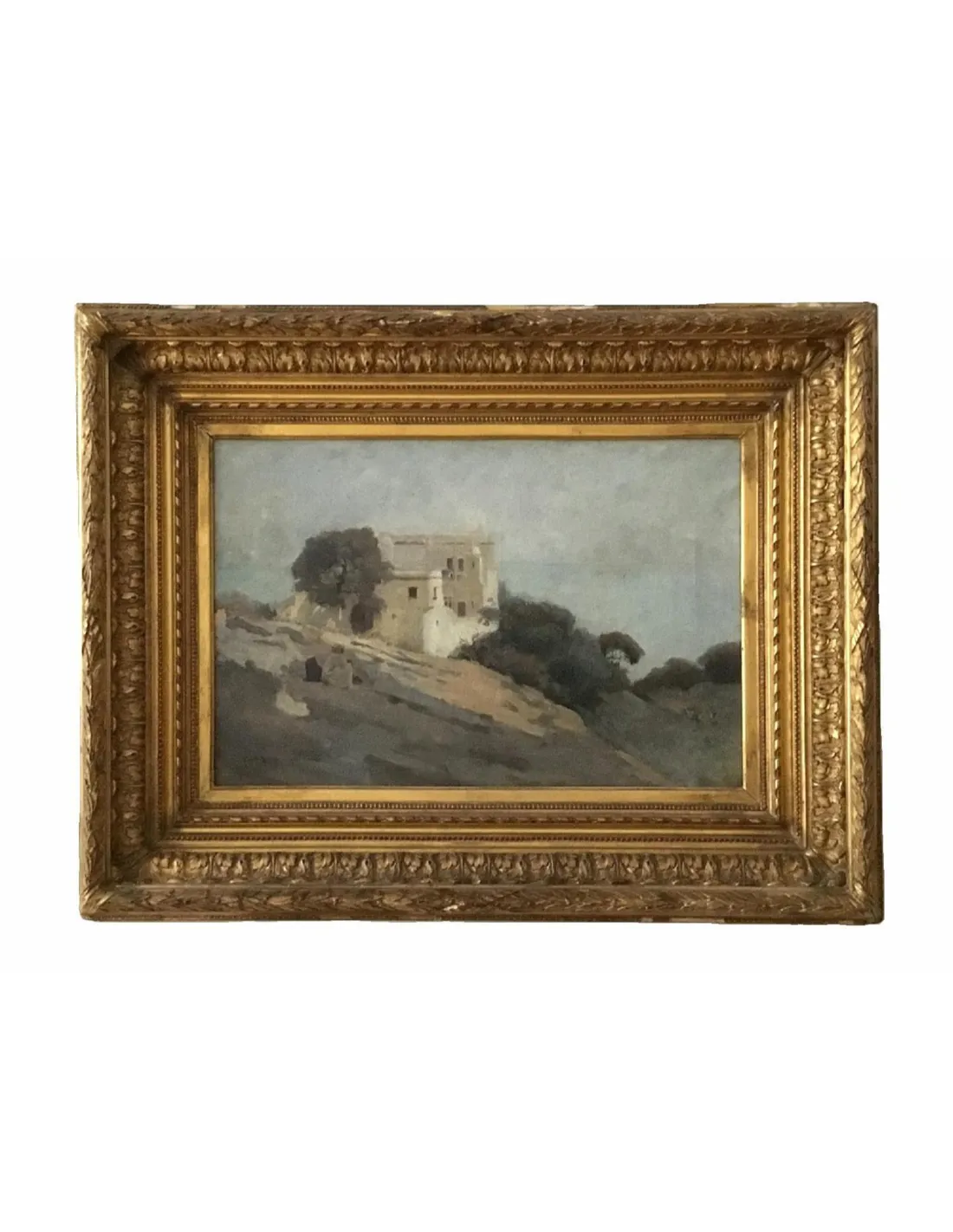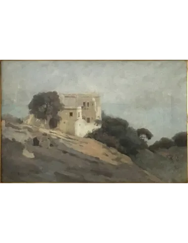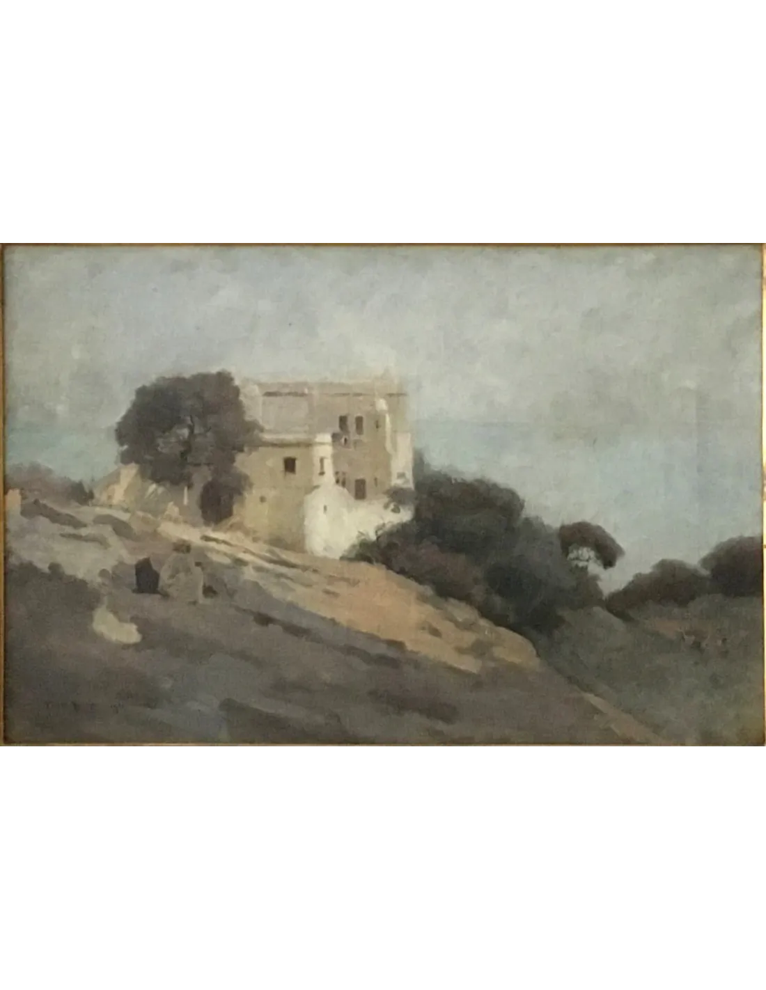 Pierre Billet's atmospheric landscape painting depicts a remote house on the Algerian coast, surrounded by trees and shrubs. The diffused sky creates a hint of morning mist. Billet's color palette is restrained: gray-blue sky, natural earth tones, and muted green. The building's architecture appears simple and serene—a quiet, almost melancholic depiction of a colonial Algerian landscape.