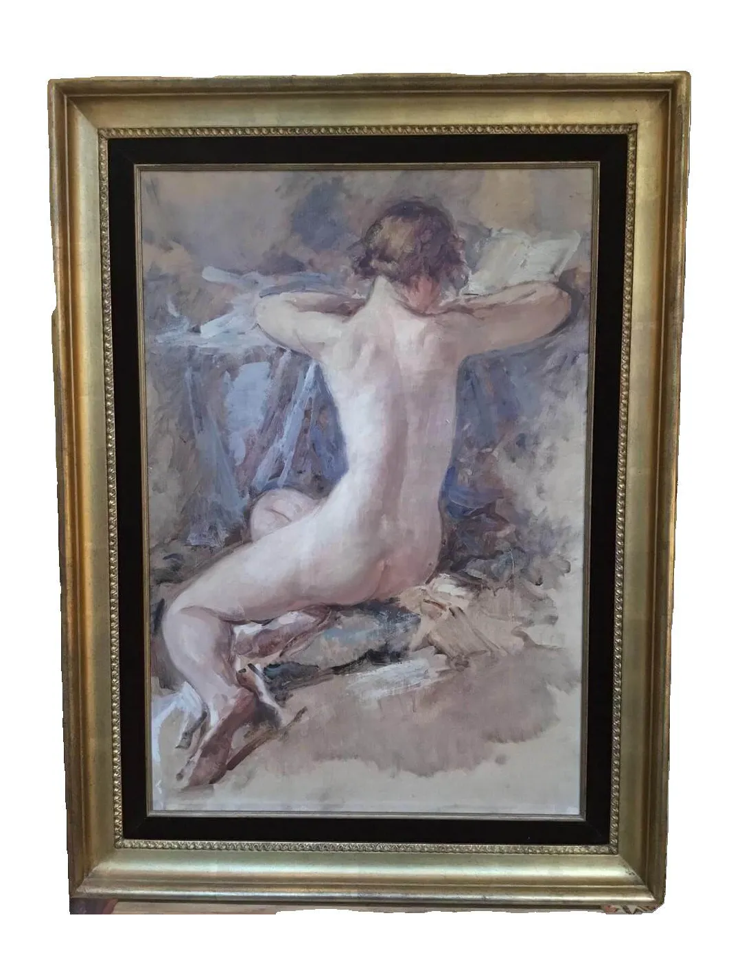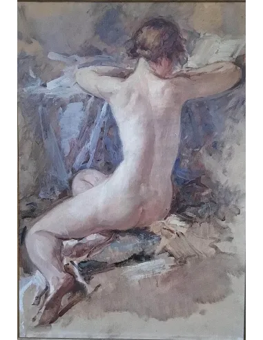 This stunning original painting by Belgian artist André Cluysenaar features a delicate nude study in the Impressionist style. Depicting a nude woman from behind, seated and engrossed in her reading, it impresses with soft brushstrokes, harmonious color schemes, and subtle lighting. The composition emphasizes both the sensuality and grace of the figure—a classic example of Cluysenaar's masterful skill in the field of nude painting.