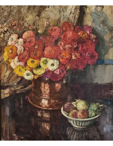 Fernand Toussaint - still life with flowers and fruits.