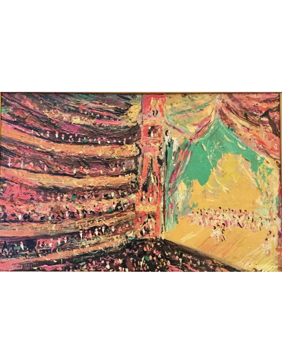 This vibrant painting by Paul Hagemans from 1933 captures the lively atmosphere of an opera house with expressive brushstrokes and bright colors. The right half of the painting depicts the stage with a bright backdrop in yellow and green tones, while on the left, the densely packed audience is arranged in several tiers. The artist works with strong contrasts and a dense texture that gives the work a thrilling dynamic. The painting impressively conveys the cultural life and emotional tension of an evening at the opera.