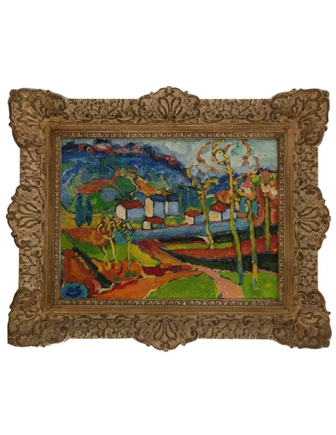 The oilpainting features strong brushwork, contrasting areas of color, simplified forms, and a flat compositional style.