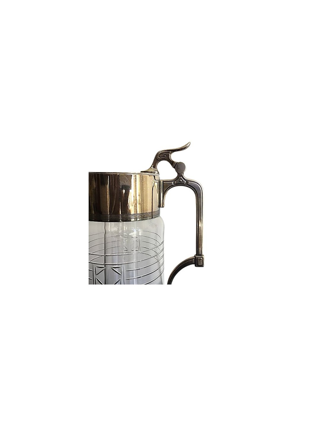 Made of colorless cut crystal glass, the wall features circumferential cut bands, while the base is decorated with a star cut. The silver-plated metal mount includes a hinged lid, a functional spout, and a raised handle. The pitcher thus represents the combination of artisanal glass production and the metalworking of the Art Nouveau period.