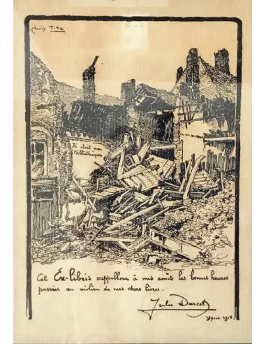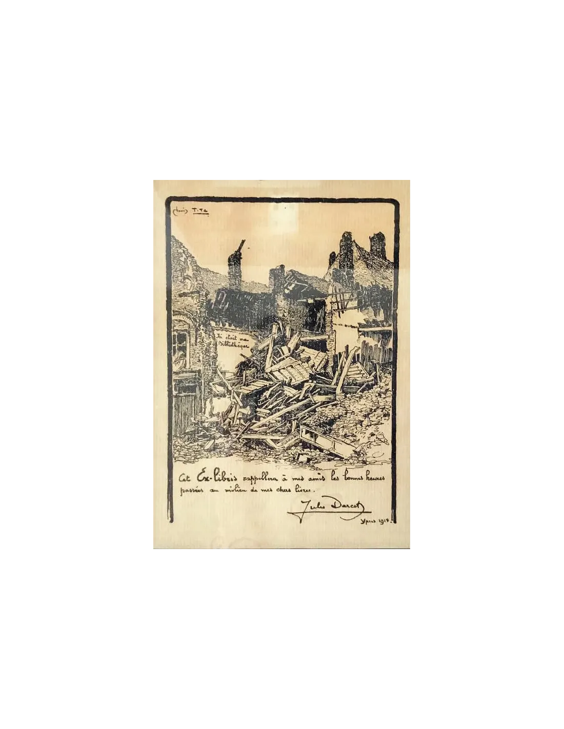 The author inscribed the exlibris with the words "Ici était ma Bibliothèque. Cet Ex-libris rappellera à mes amis les bonnes heures passées au milieu de mes chers livres".