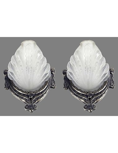 This elegant pair of Art Deco wall lights dates from around 1920/30. The satin-finish pressed glass shades are leaf-shaped with a beautiful relief texture. This ensures even light distribution.