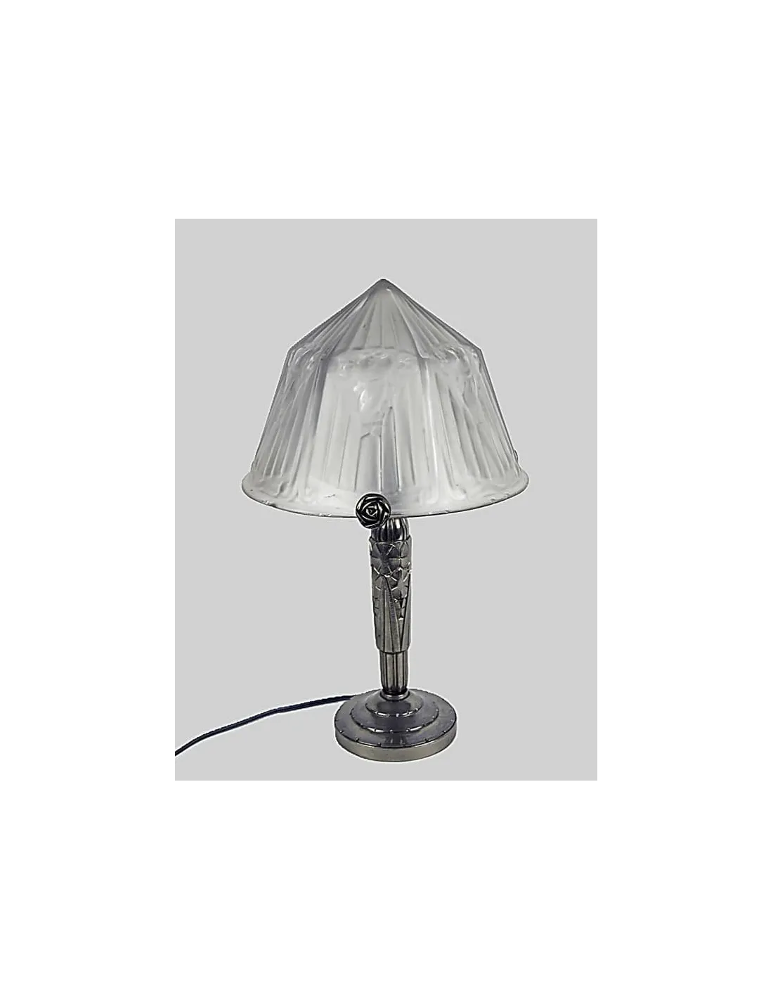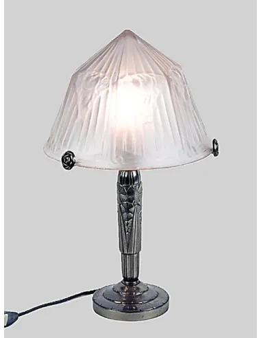 A fine, small table lamp in the classic French Art Deco style, made around 1925. The lampshade, in the characteristic mushroom shape, is made of frosted pressed glass with a geometric, faceted pattern that, in combination with the light, creates a subtle sense of depth.