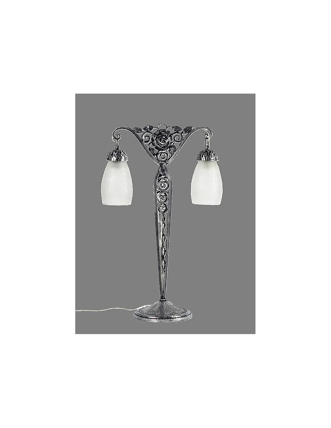 The slender wrought iron base is adorned with a delicate floral rose decoration and supports a double lampshade made of satin-finished glass. The lamp stands at an impressive height of 60 cm.