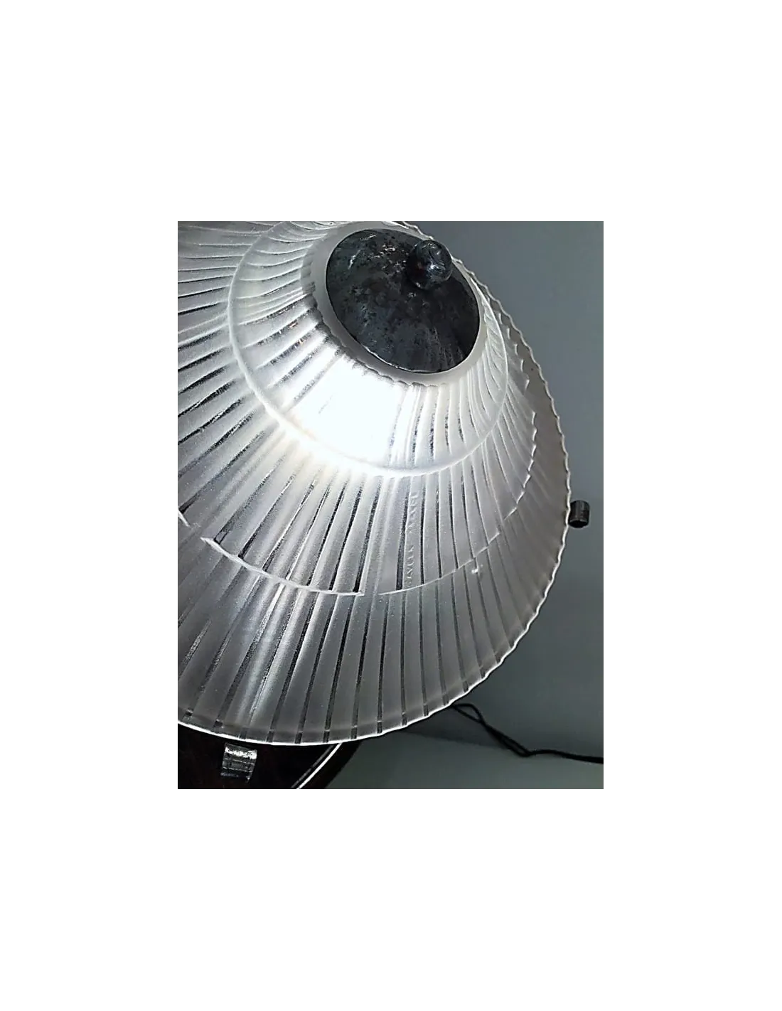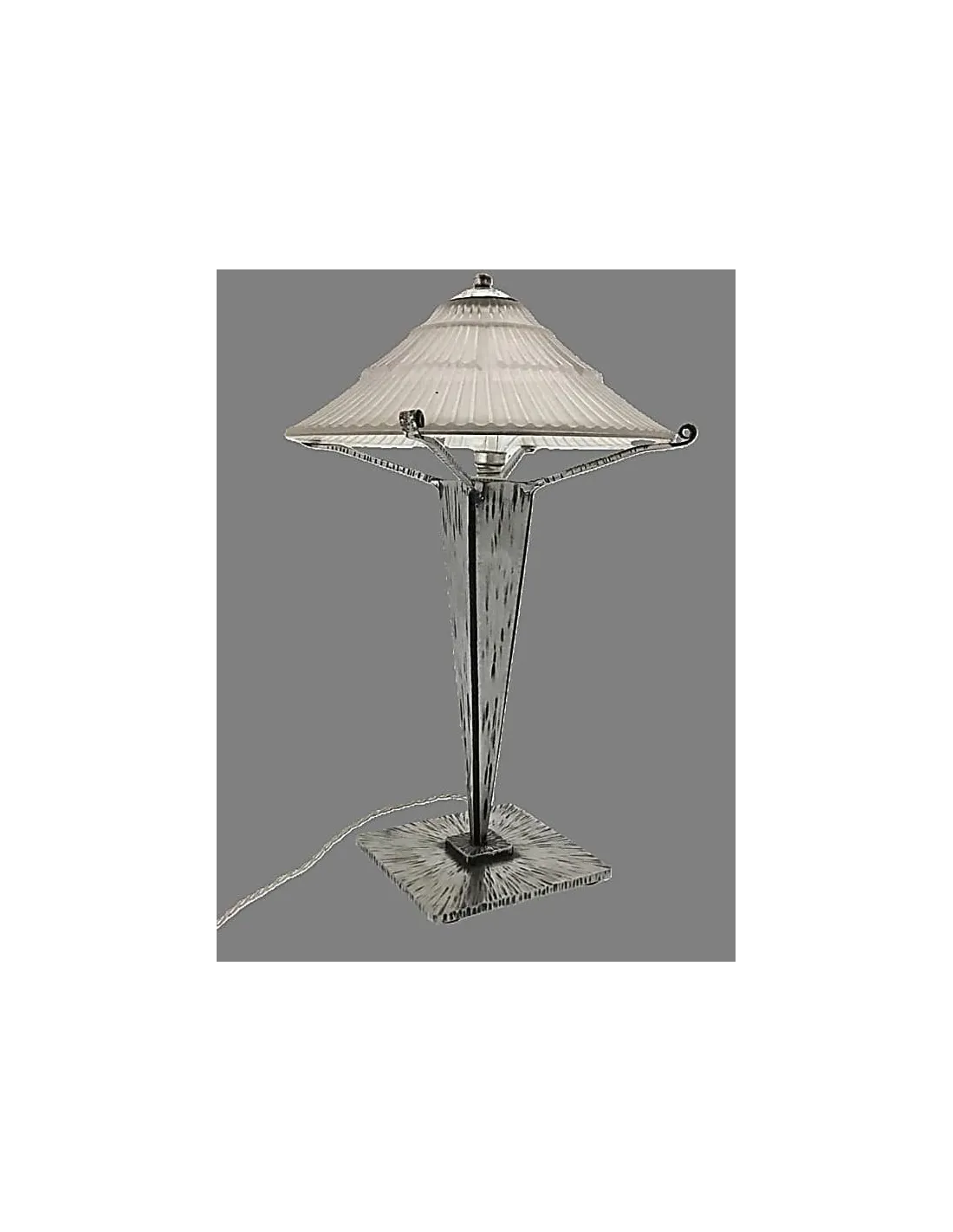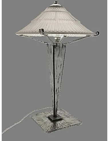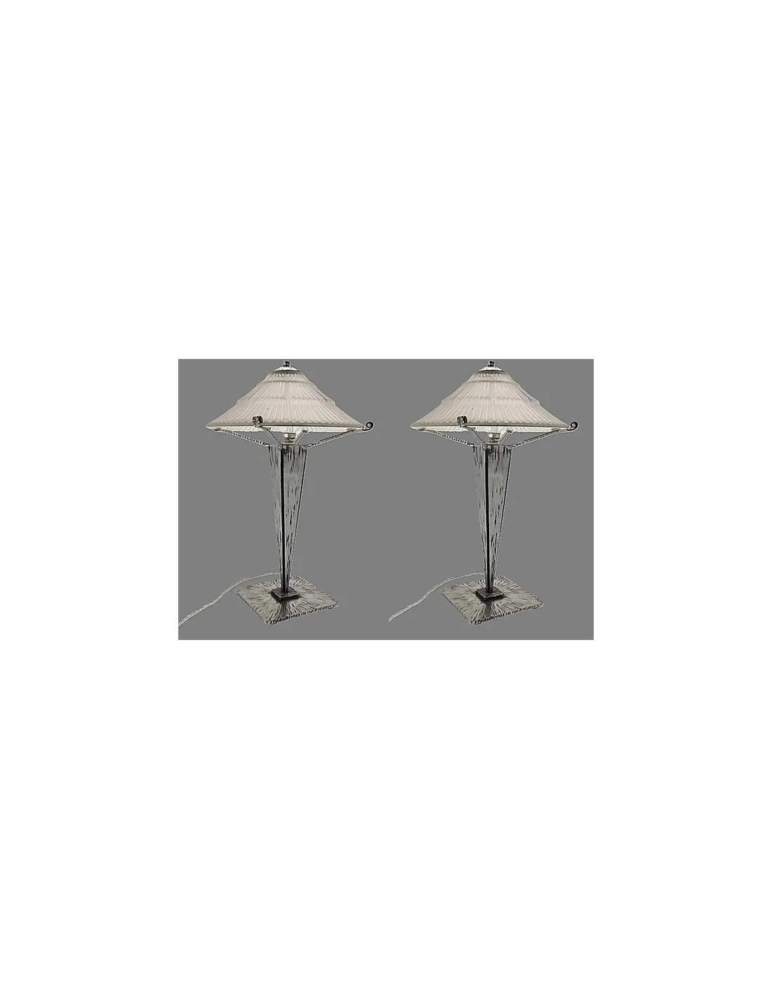 This elegant pair of French Art Deco table lamps features a refined interplay of geometric form and decorative elegance. The sharply tapered metal base with silver bronze finish contrasts harmoniously with the finely stepped frosted glass shades, which diffuse light softly and evenly throughout the space. The structured surface of the glass enhances the sculptural appearance and creates a warm, atmospheric lighting effect.