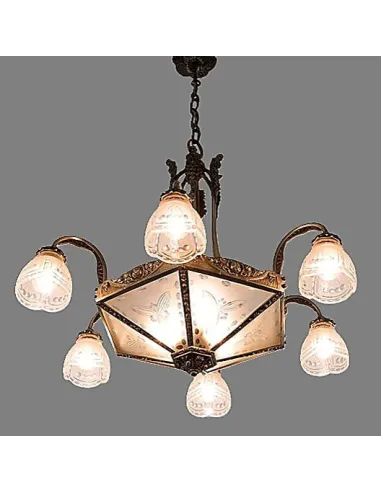 The hexagonal central body made of etched glass features stylized floral motifs that provide soft light distribution. Six elegantly curved arms support glass chalices as lampshades, harmoniously complementing the classic design.