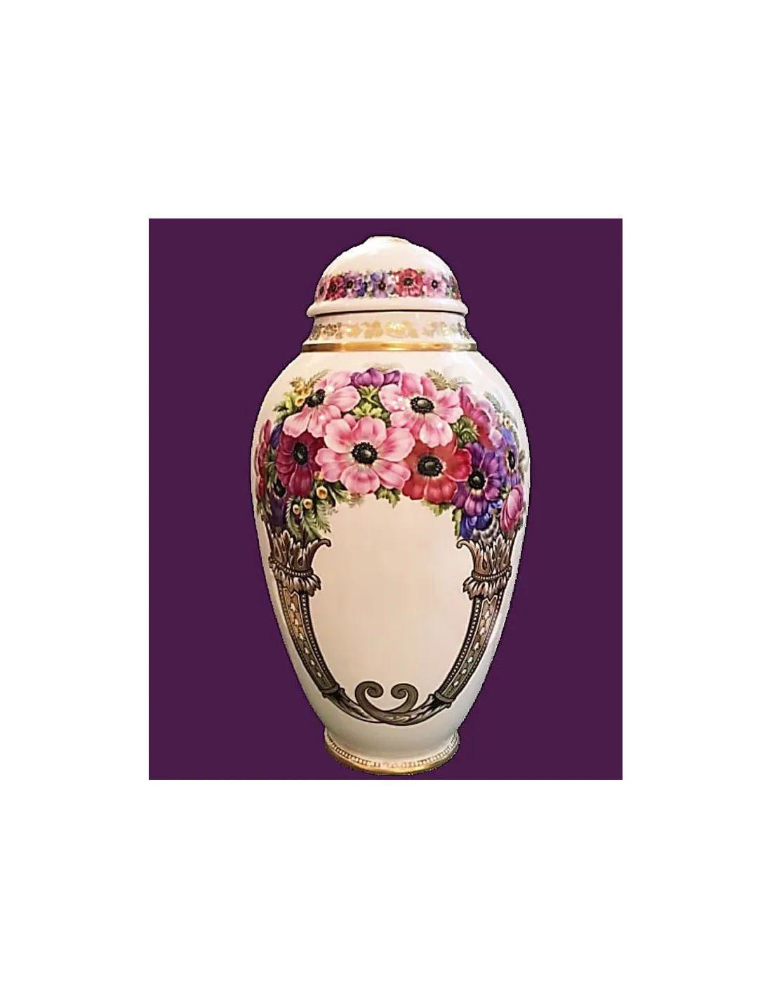 This exquisite porcelain vase by Lorenz Hutschenreuther, crafted around 1920 in the renowned Department of Art in Selb, features a magnificent hand-painted anemone design in shades of pink, red, and violet, adorned with delicate gilded details. The lid harmoniously echoes the floral motif and accentuates the elegant lines.
