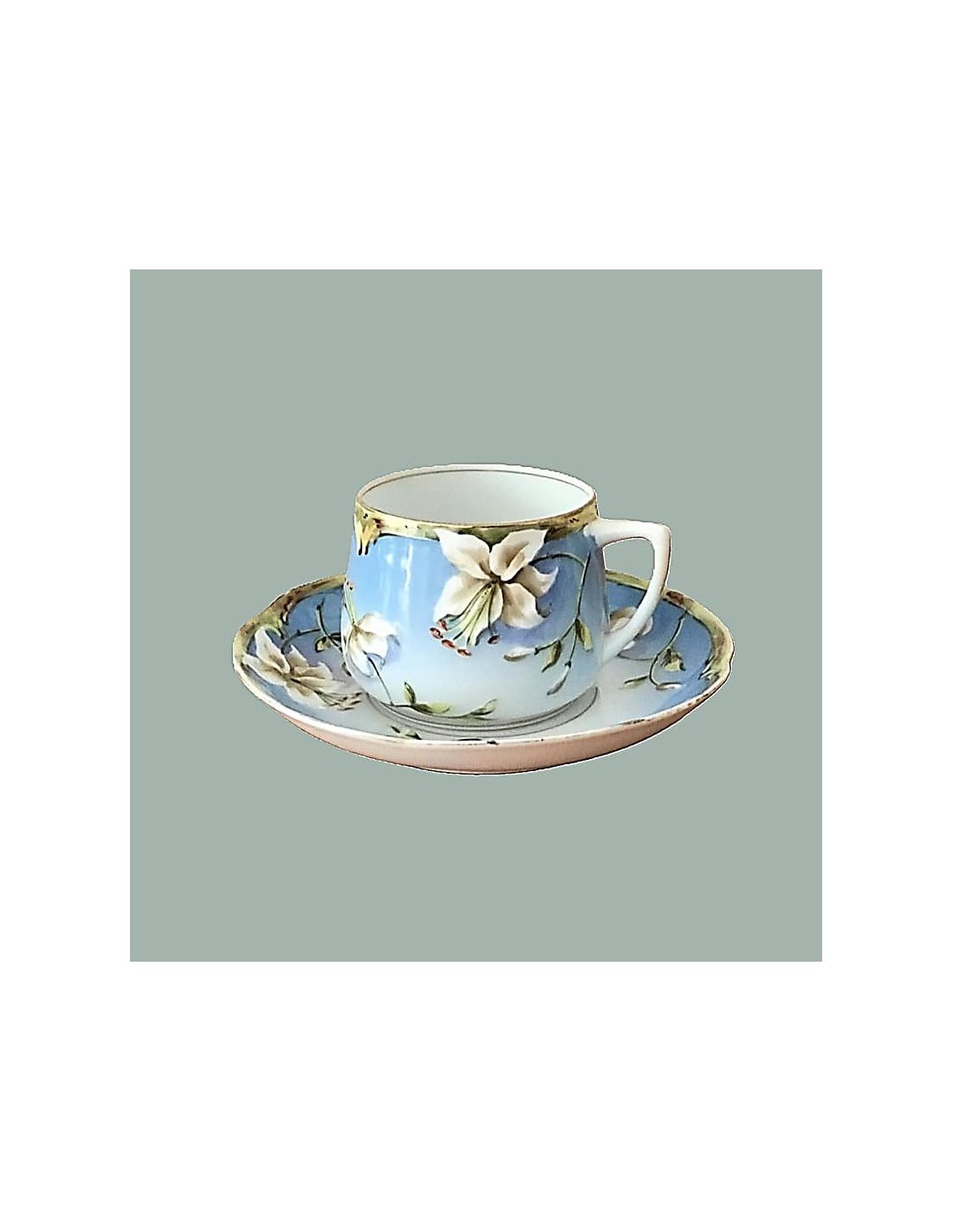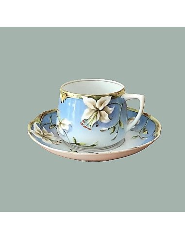 The floral decoration with delicate white blossoms on a blue background and fine gold rim decoration reflects the typical Art Nouveau design. The natural lines and gentle color transitions lend the cup lightness and elegance.