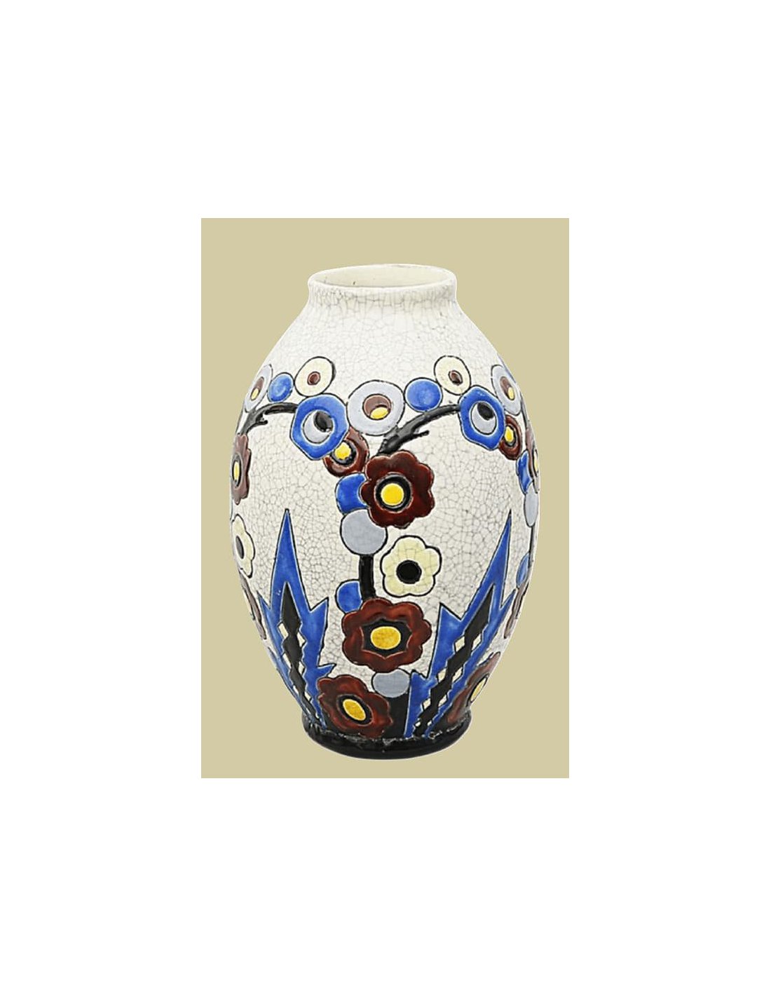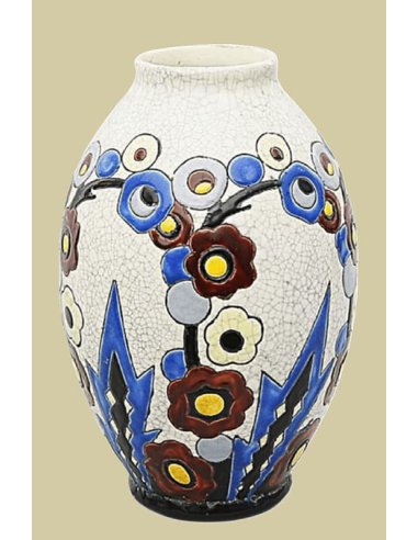 Rare Art Deco ceramic vase by renowned designer Charles Catteau for the Belgian manufacturer Boch Frères Keramis. This original, signed piece most likely dates from the mid-1920s. It features a stylized floral decoration in bright enamels all around. The characteristic decoration is limited to blue, red, yellow, and black on a white crackle glaze.