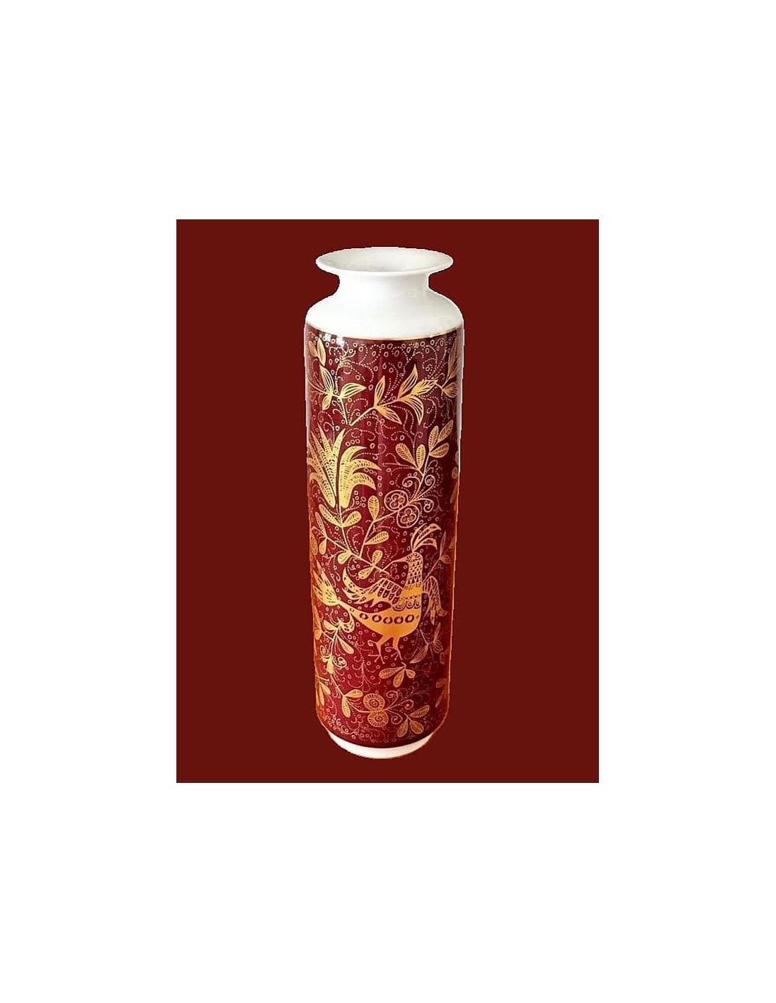 This elegant porcelain vase by Lorenz Hutschenreuther AG Selb dates from the 1970s and features a richly detailed gold decor with bird motif on a ruby red background.