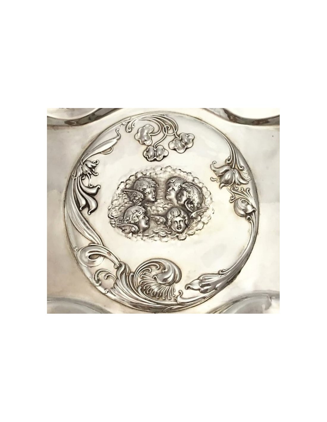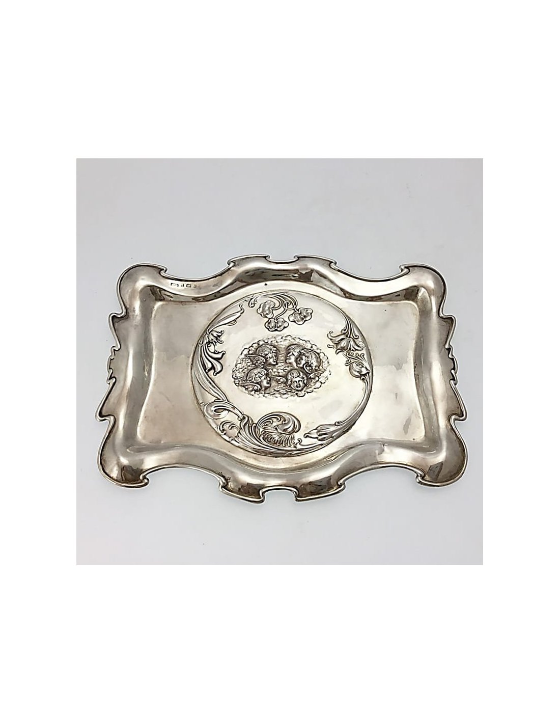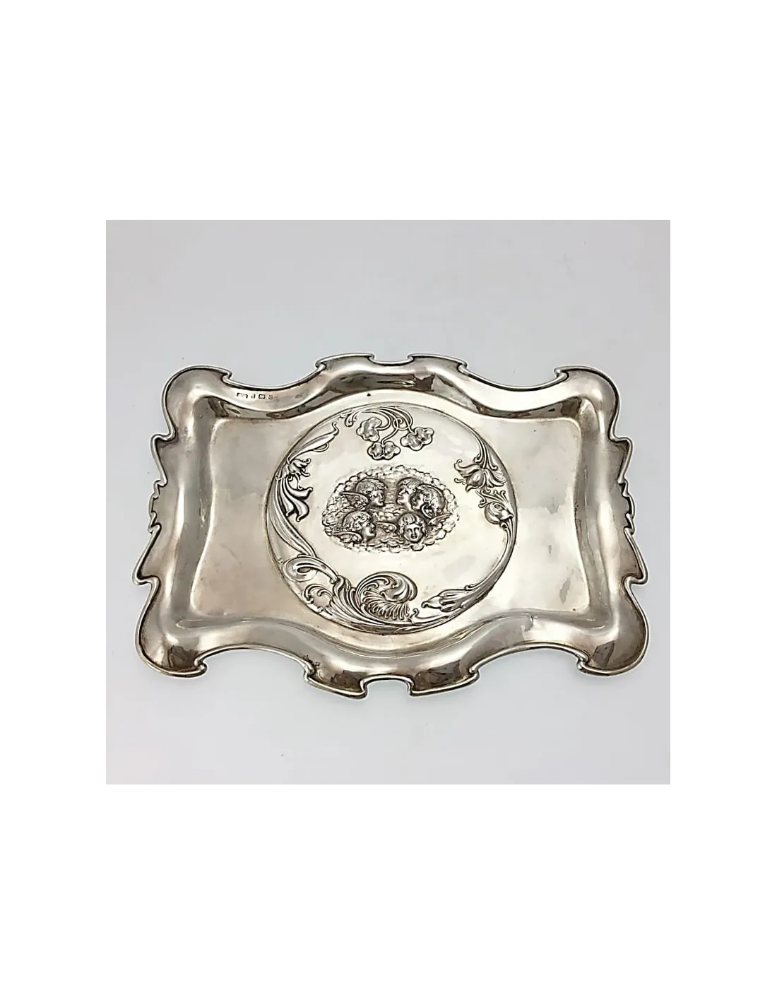 Rectangular tray with slightly concave sides and an outward-flaring rim. In the center, an oval medallion finely engraved with five winged cherub heads (putti), surrounded by delicate foliate and floral scrollwork.