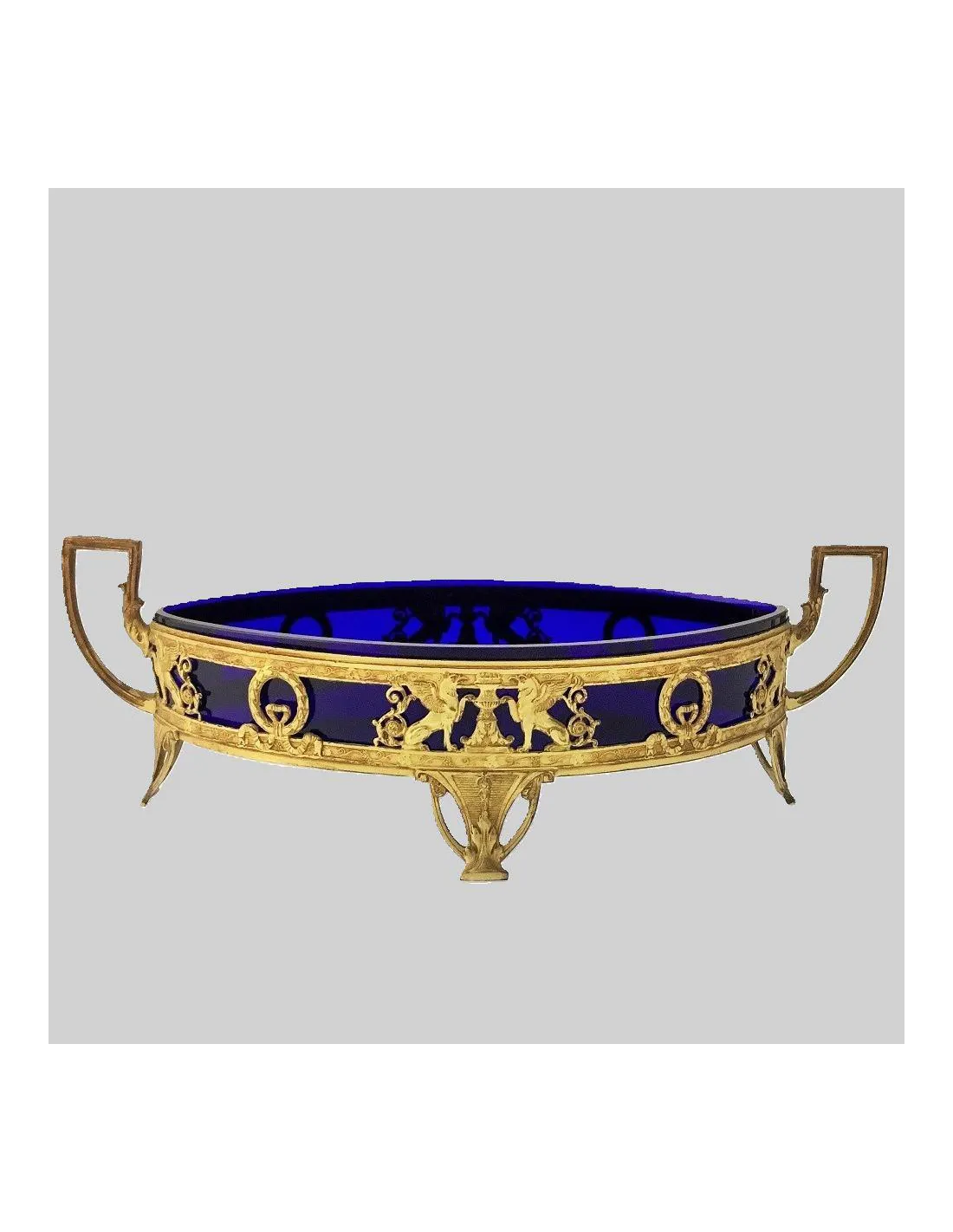 The finely crafted, oval mount stands on three conical feet. It is made of fire-gilt bronze. It features a surrounding, openwork gallery with antique-style ornaments such as griffins, laurel wreaths, and ribbon motifs. Two side handles frame the form. The removable cobalt-blue glass insert creates a beautiful color contrast with the gleaming golden bronze.