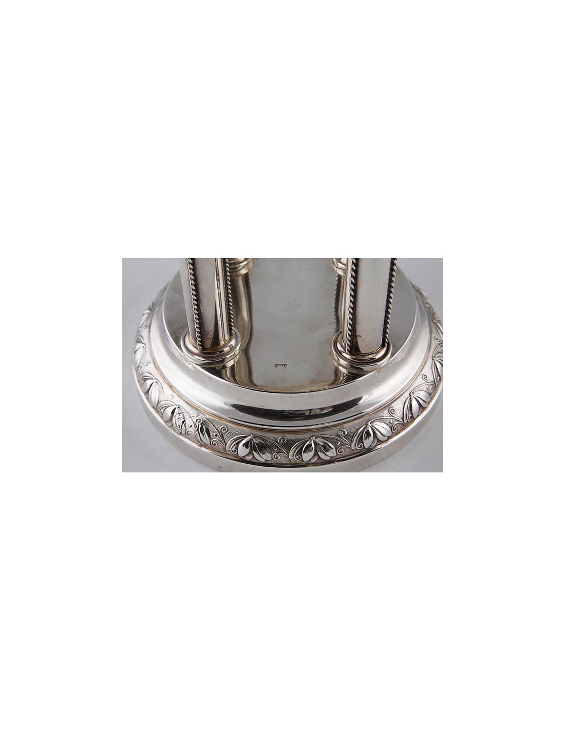 This extraordinary centerpiece impresses with its harmonious proportions, finely executed silver plating, and subtle ornamentation with delicate leaf decoration in relief. It is an outstanding example of Austrian silver and metal art and fully embodies the elegance and precision of Viennese Art Nouveau in its late heyday.