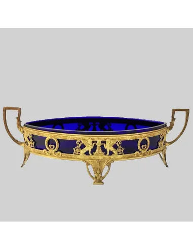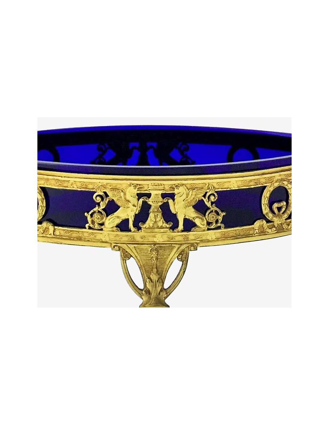 La monture ovale, finement ouvragée, repose sur trois pieds coniques. Elle est en bronze doré au feu. Elle est ornée d'une galerie ajourée ornée d'ornements de style antique tels que des griffons, des couronnes de laurier et des motifs de rubans. Deux poignées latérales encadrent la forme. L'insert amovible en verre bleu cobalt crée un magnifique contraste de couleurs avec le bronze doré brillant.