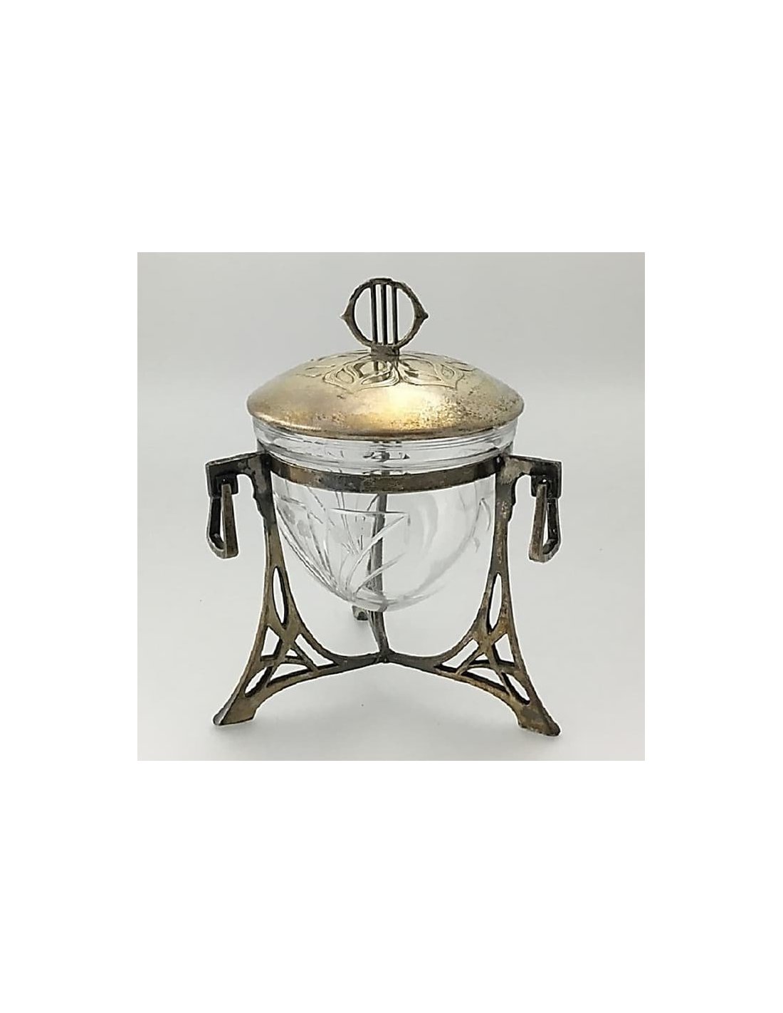 Élégante bonbonnière avec un support en laiton argenté et un insert en cristal taillé. Le support ajouré en forme de trèfle, orné de montants linéaires et de poignées finement travaillées, est caractéristique du style Art nouveau de la Württembergische Metallwarenfabrik (WMF), à son apogée.