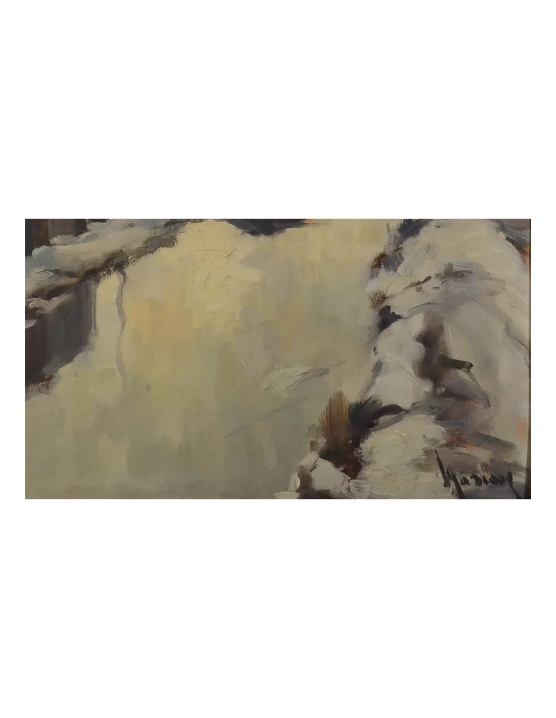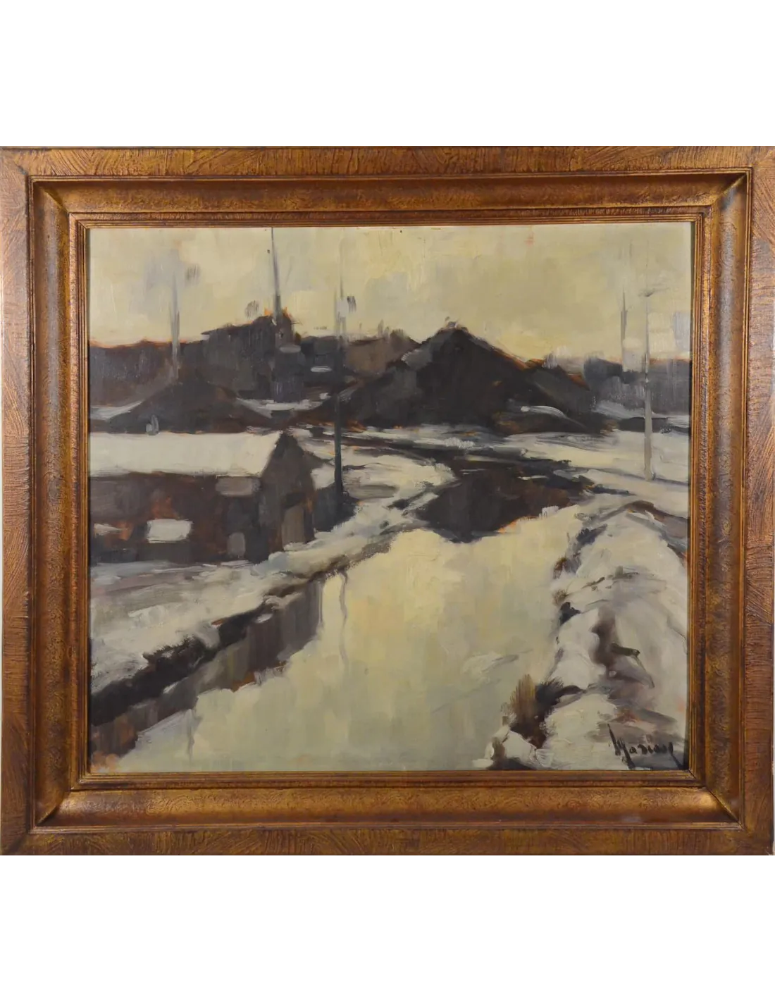 Ce tableau d'Albert Mascaux représente un paysage hivernal paisible et enneigé, probablement dans les Ardennes. Originaire de Wallonie, Mascaux aimait peindre les paysages ardennais, utilisant souvent des nuances de gris et de brun. Toits enneigés, arbres nus, rivière glacée et lumière hivernale diffuse capturent l'atmosphère paisible du village enneigé. Le tableau allie harmonie naturelle et nostalgie, typique du réalisme belge de Mascaux au XXe siècle.